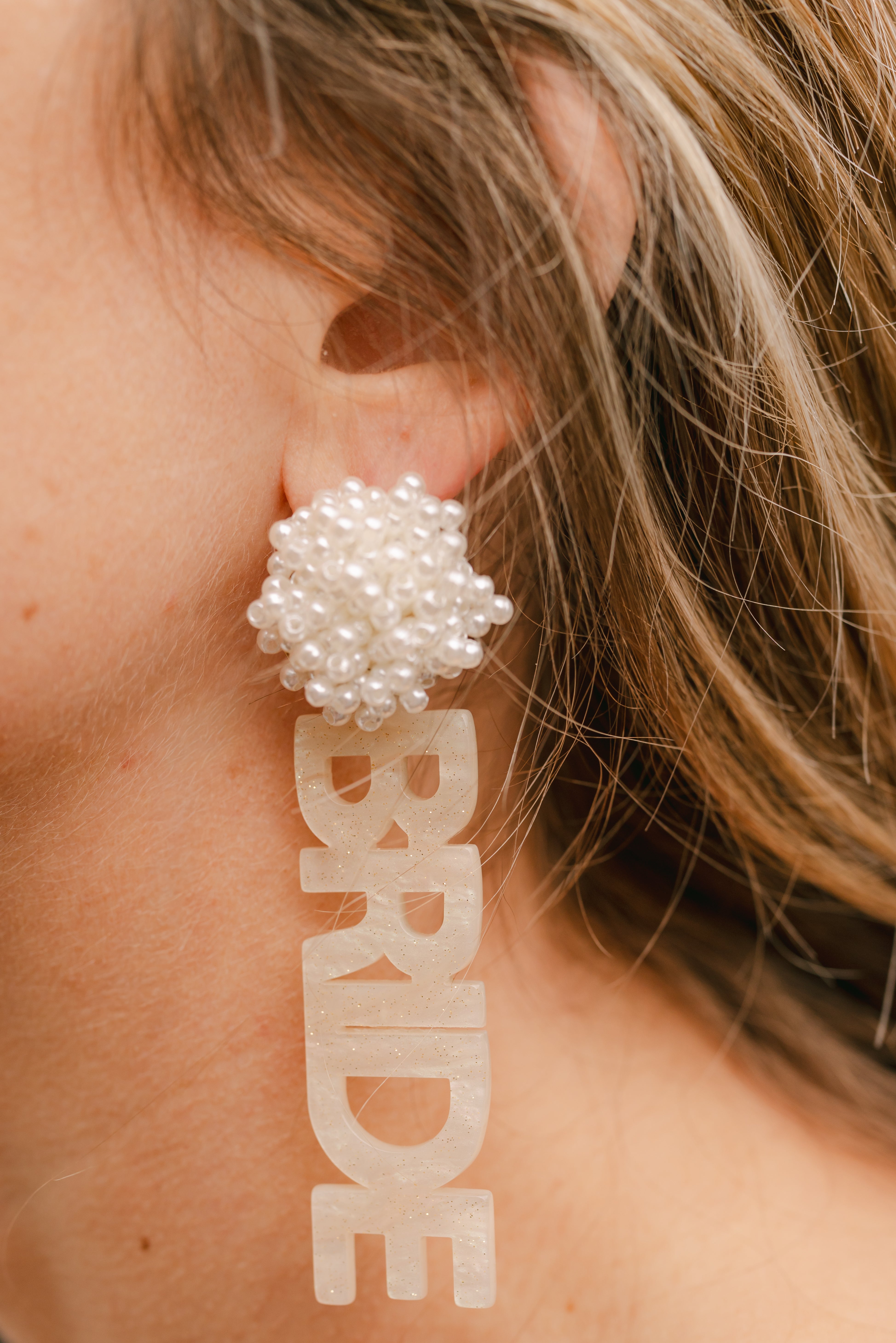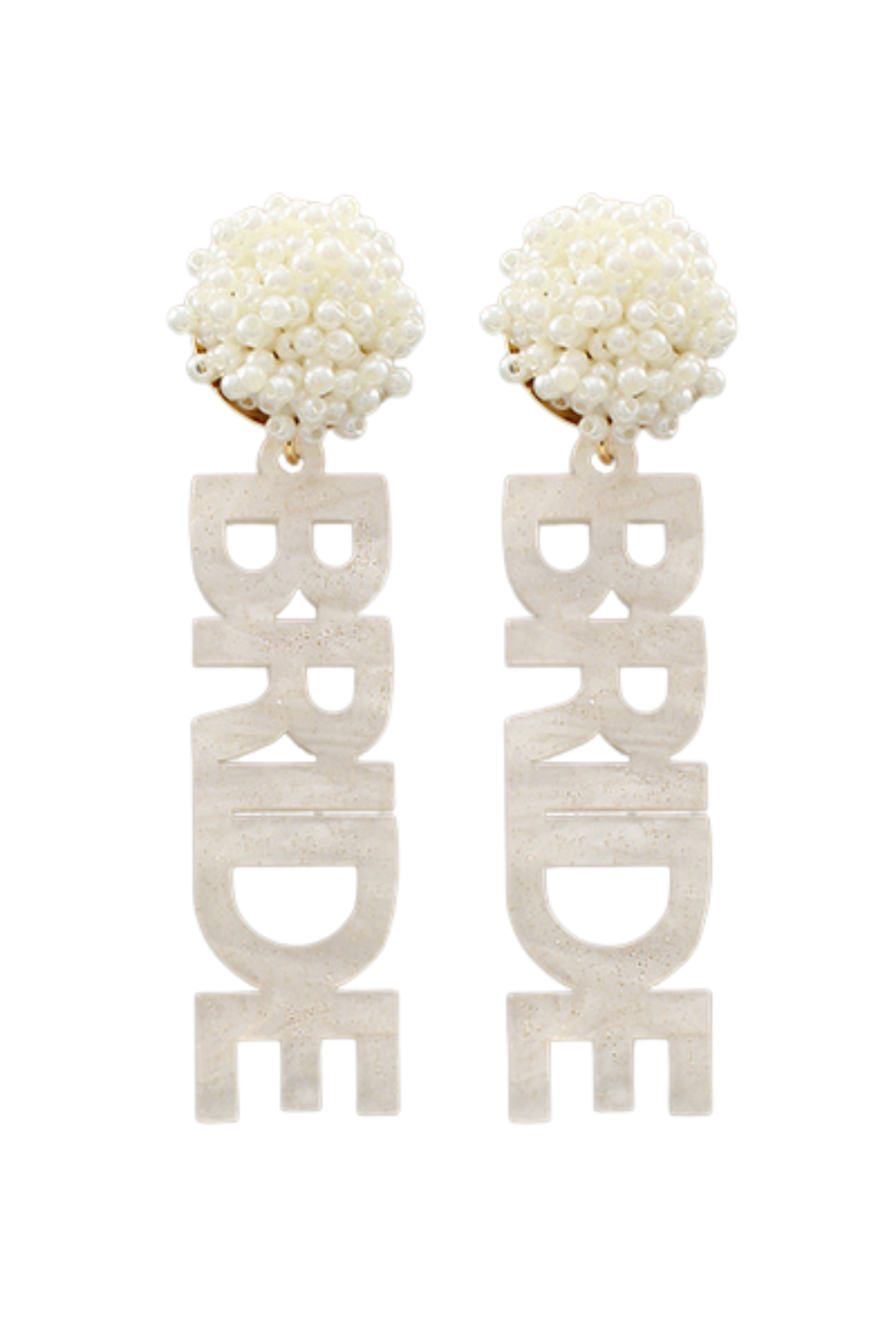 Celebrate in style with these bold “BRIDE” drop earrings, topped with a playful cluster of beads. They’re the perfect statement accessory for showers, parties, and all your pre-wedding fun. A festive finishing touch for the bride-to-be.