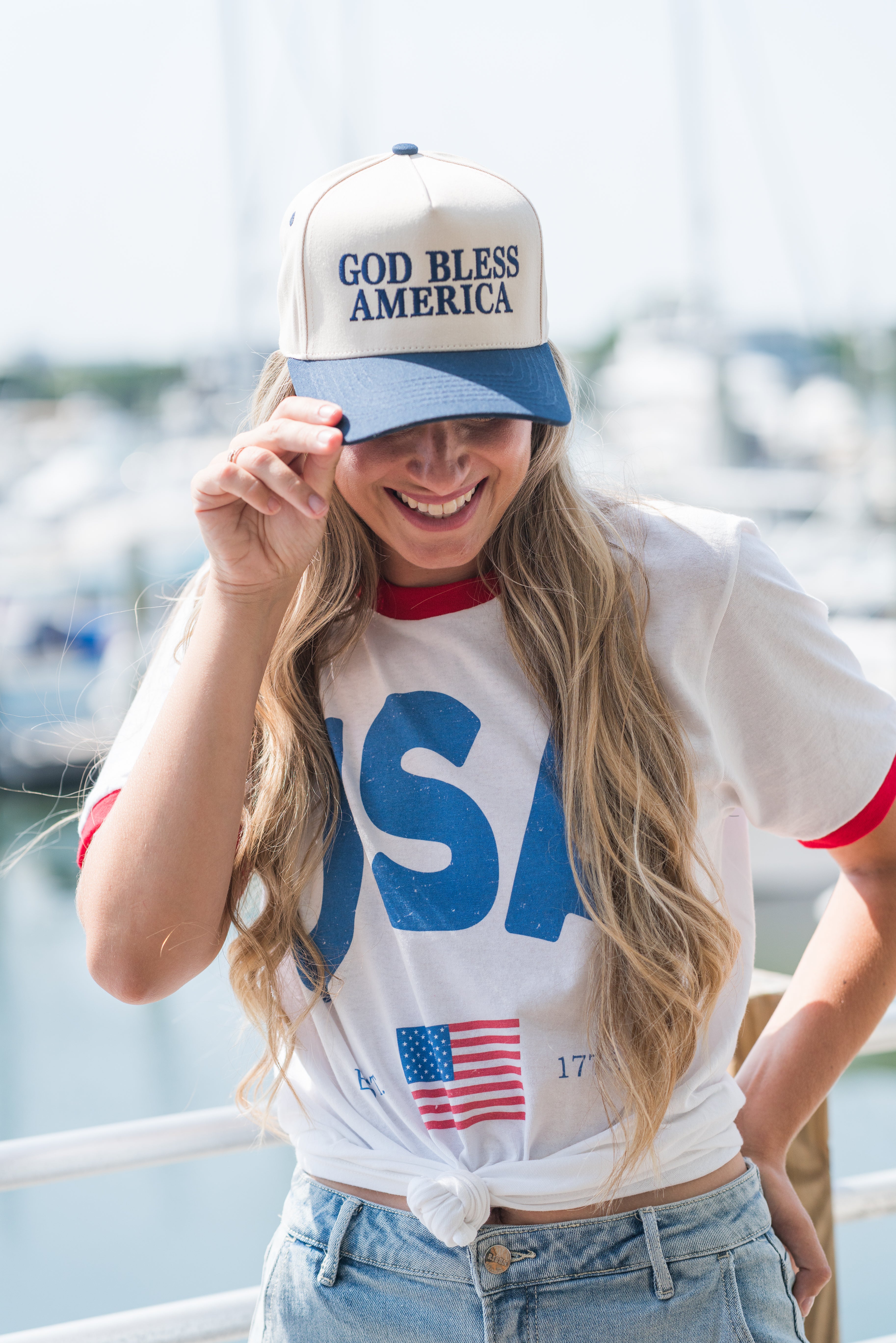 Show your patriotic spirit with the USA Vintage Ringer Graphic Tee. Featuring classic contrasting trim and a timeless design, this tee combines comfort with a retro vibe perfect for casual outings or festive celebrations. Made from soft, breathable fabric, it ensures all-day comfort while making a bold statement of American pride. Elevate your wardrobe with this versatile and stylish ringer tee.