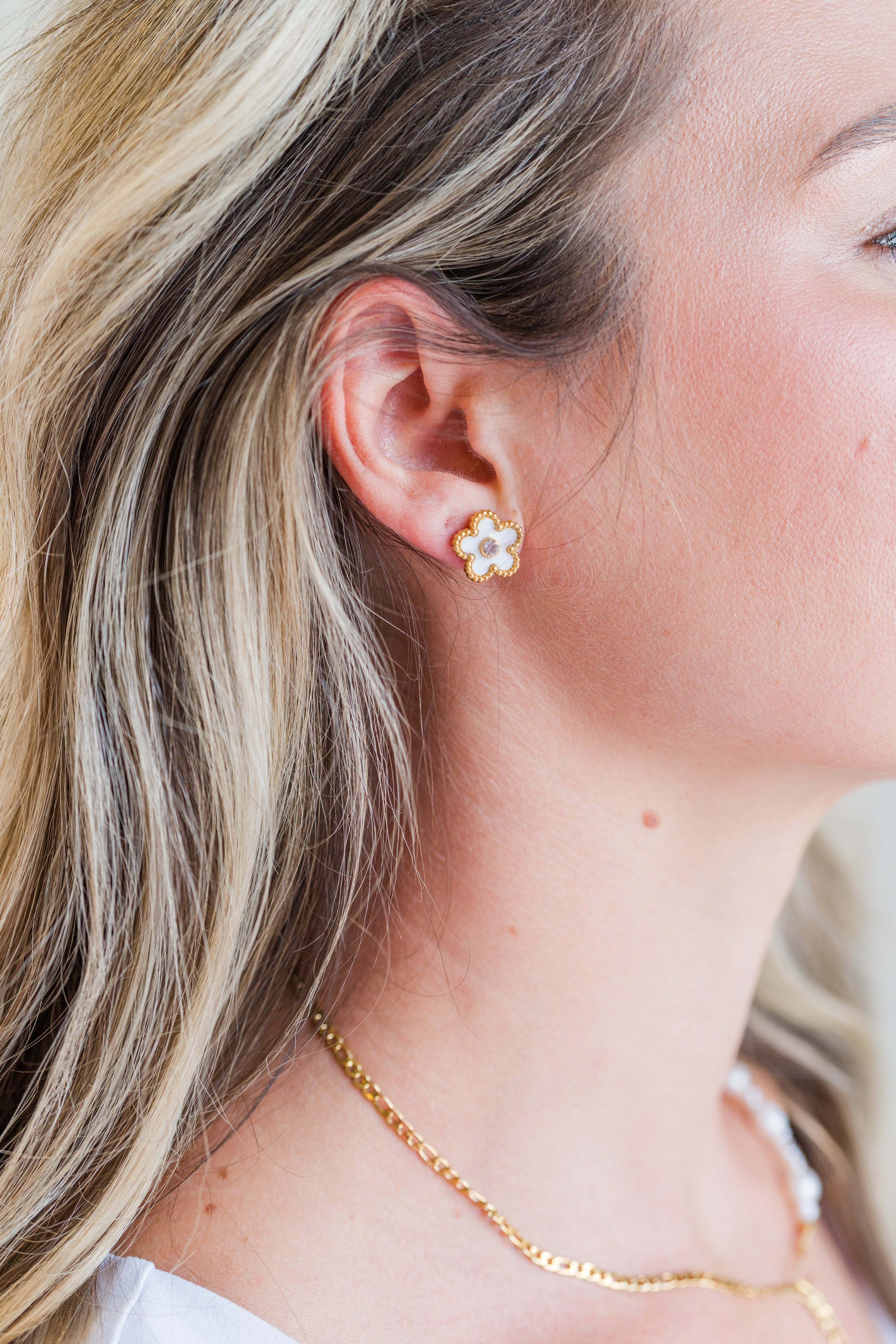 Feminine and elegant, these stud earrings feature a delicate white mother of pearl flower framed in gold beading and finished with a sparkling diamond-like stone at the center. The perfect blend of charm and sophistication, they add a fresh and timeless touch to any outfit.
