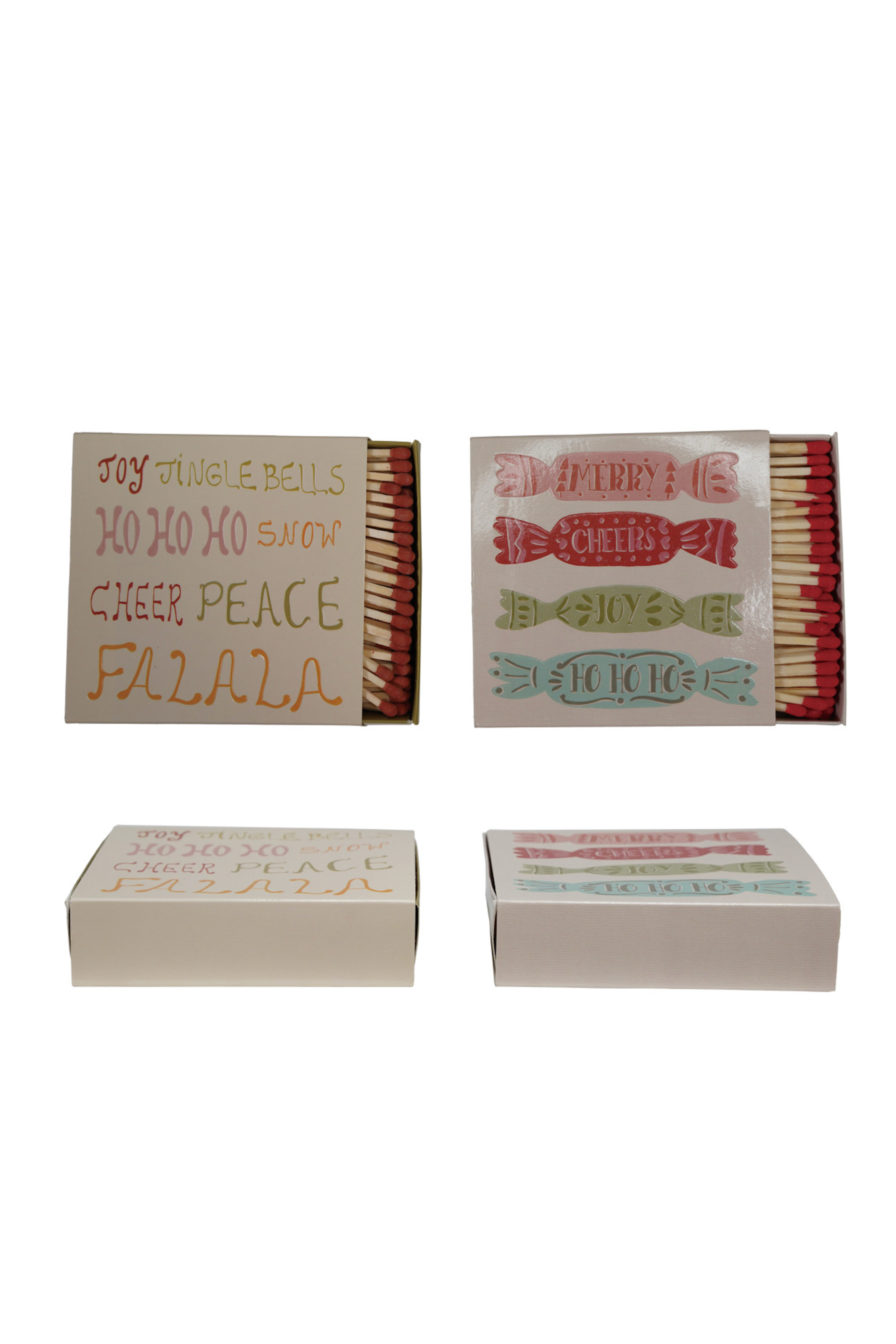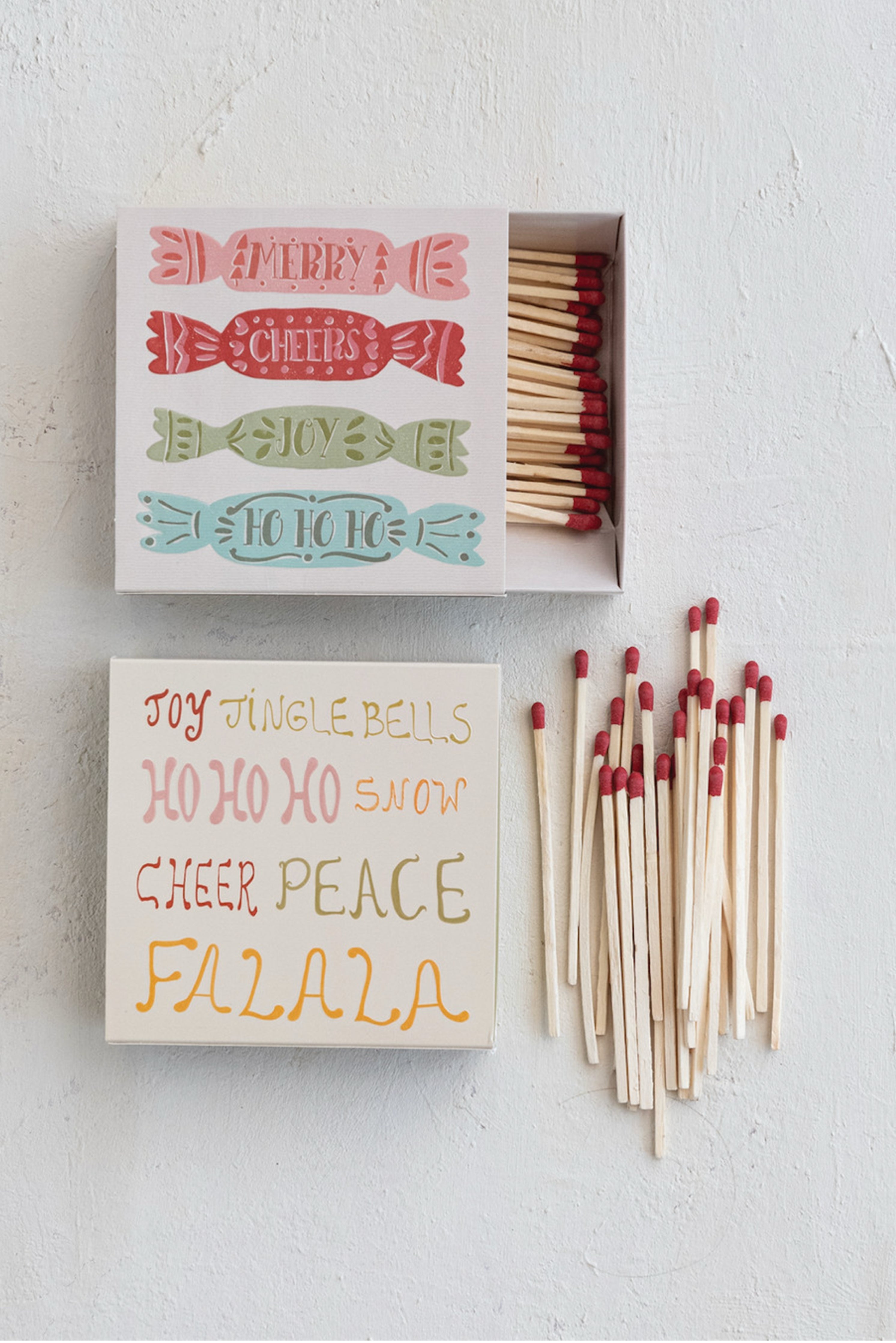 Light up the season with these festive holiday matchboxes, featuring playful designs and cheerful holiday phrases. Each box is filled with sturdy red-tipped matches, perfect for lighting candles, fireplaces, or seasonal décor. Both practical and decorative, they make a charming stocking stuffer, hostess gift, or holiday accent.