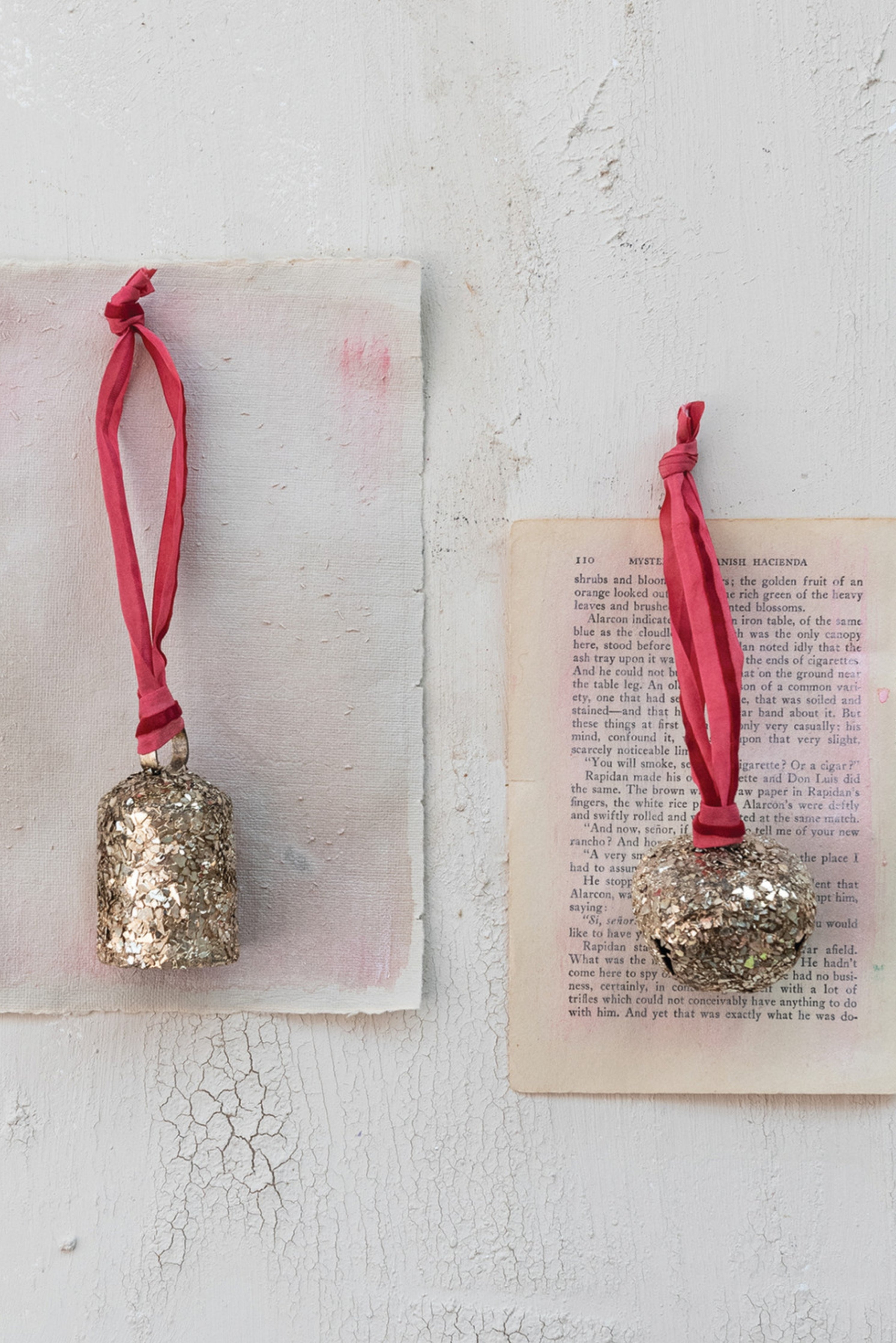 This Metal & Glass Ornament combines rustic charm with festive sparkle. Designed with textured metallic detailing and paired with a bold red ribbon, it makes a striking addition to your holiday tree or décor.