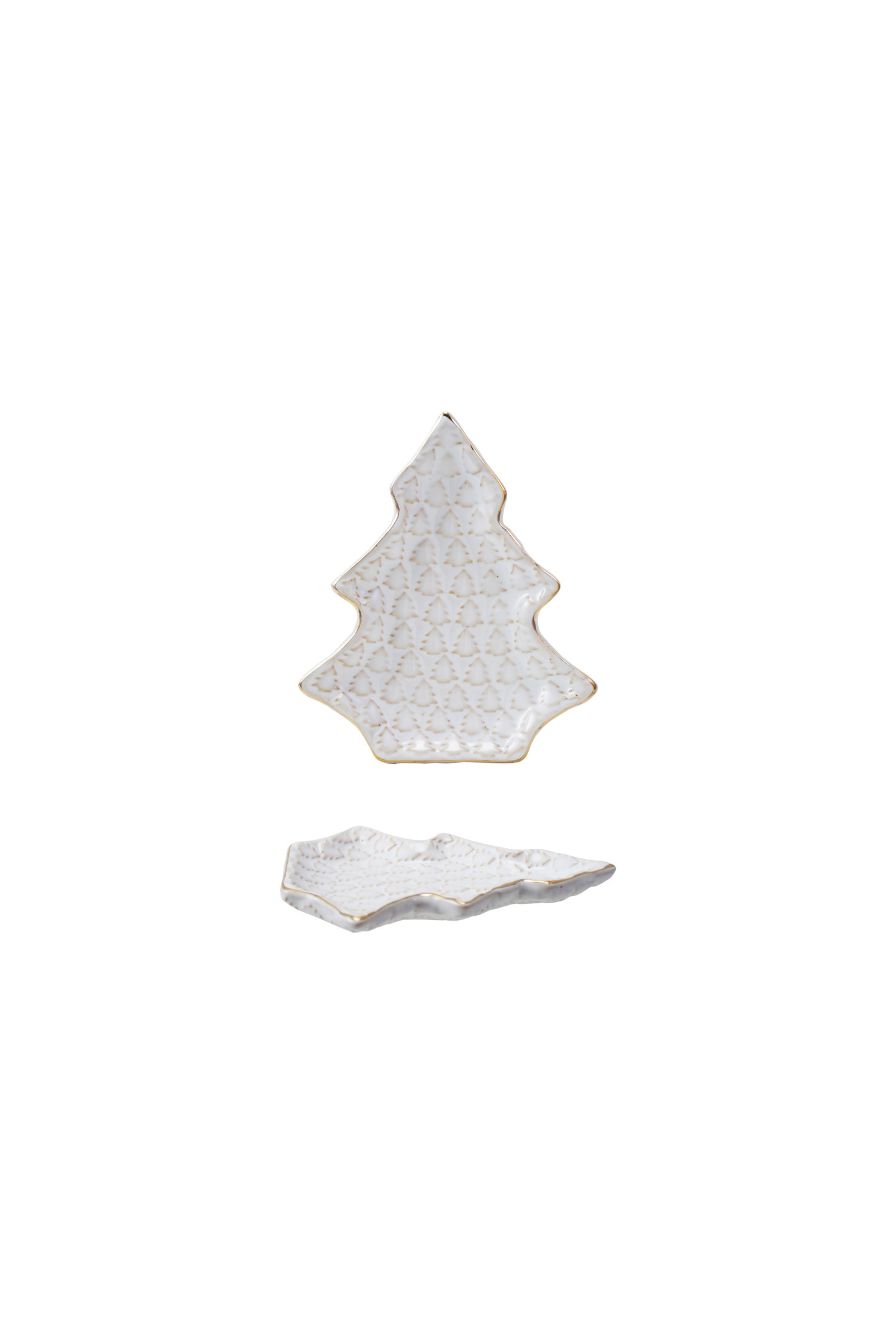 Serve in style with this festive tree-shaped stoneware dish featuring a delicate embossed pattern and shimmering gold rim. Perfect for candies, appetizers, or décor, it adds an elegant holiday touch to any table setting.