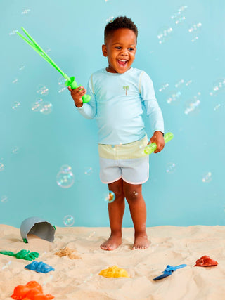 Get ready for a day of fun in the sun with our Seersucker Rash Guard & Swim Trunks Set! Designed with a playful seersucker neckline, the embroidered nylon spandex rash guard offers both style and comfort. Paired with peached nylon seersucker swim trunks, complete with twill tape waist ties, this 2-piece set is perfect for kids who love to make a splash.