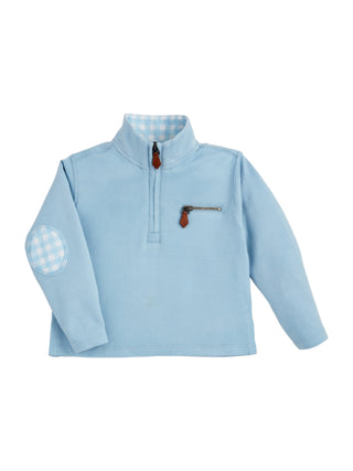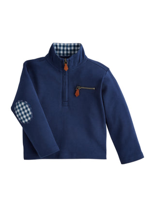 This stylish quarter zip pullover for kids is made of soft and durable cotton interlock fabric. The gingham lining adds a touch of elegance, while the faux zipper chest pocket and gingham elbow patches add functional and fashionable details. The side vent hem ensures a comfortable and stylish fit. Perfect for any young fashionista looking to make a statement!