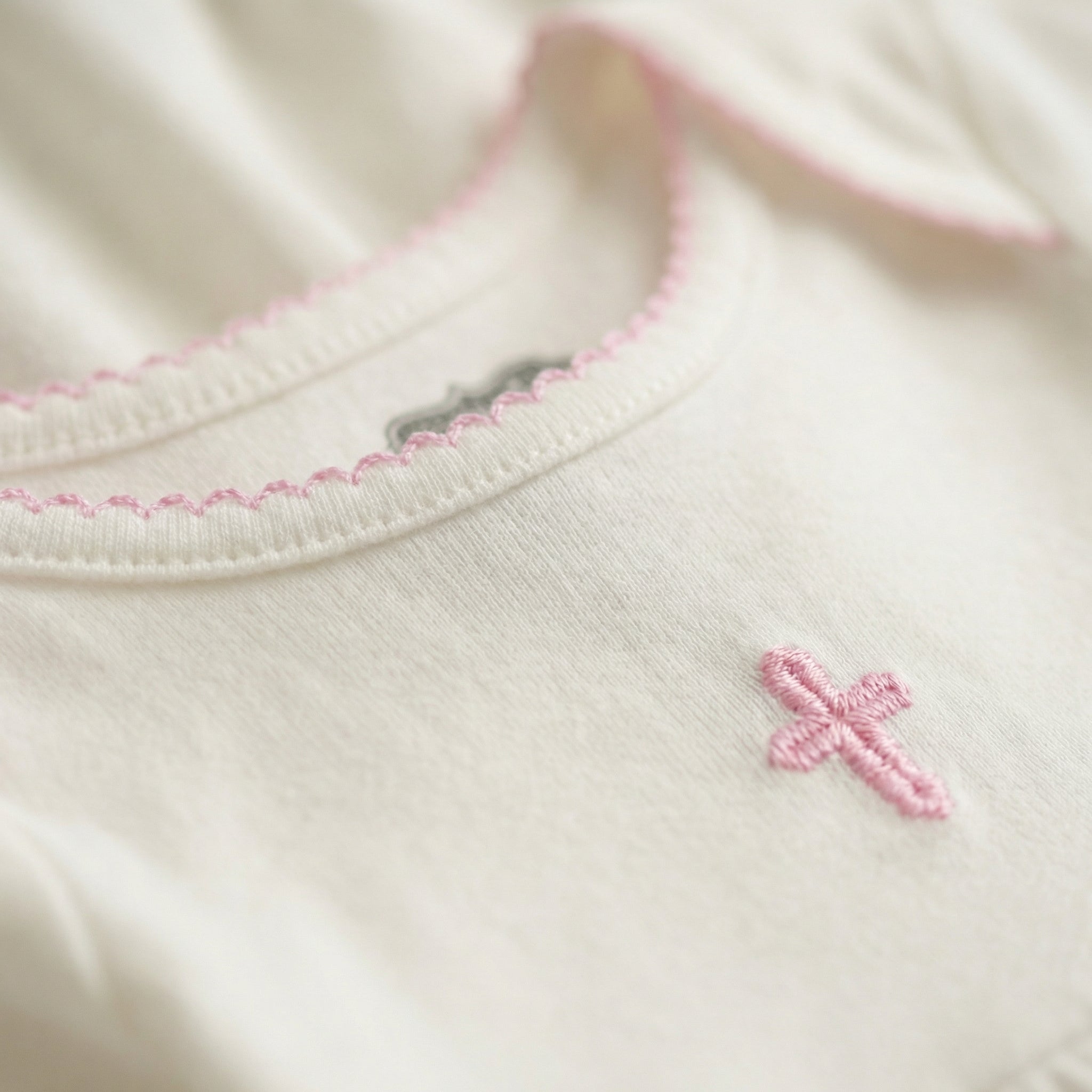 This soft baby gown features a timeless, minimalist design accented with delicate cross embroidery for a sweet, meaningful touch. Crafted from a gentle, breathable fabric, it’s designed to keep baby comfortable during sleep or cuddle time.