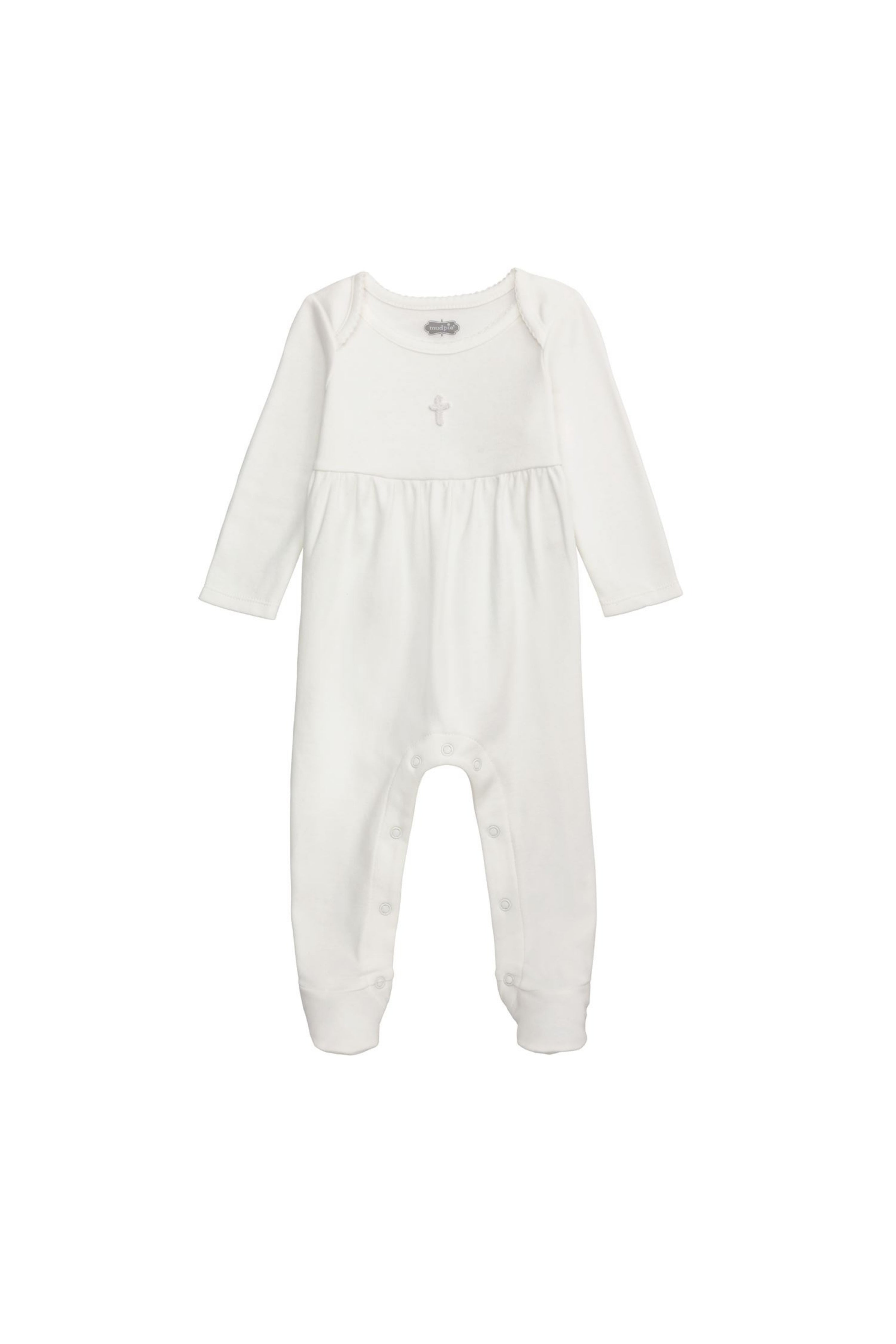 The Crochet Cross Sleeper is a beautifully crafted footed sleeper designed for your little one's comfort and style. It features a charming crochet cross icon that adds a touch of elegance, while the lap shoulders make dressing and undressing a breeze.