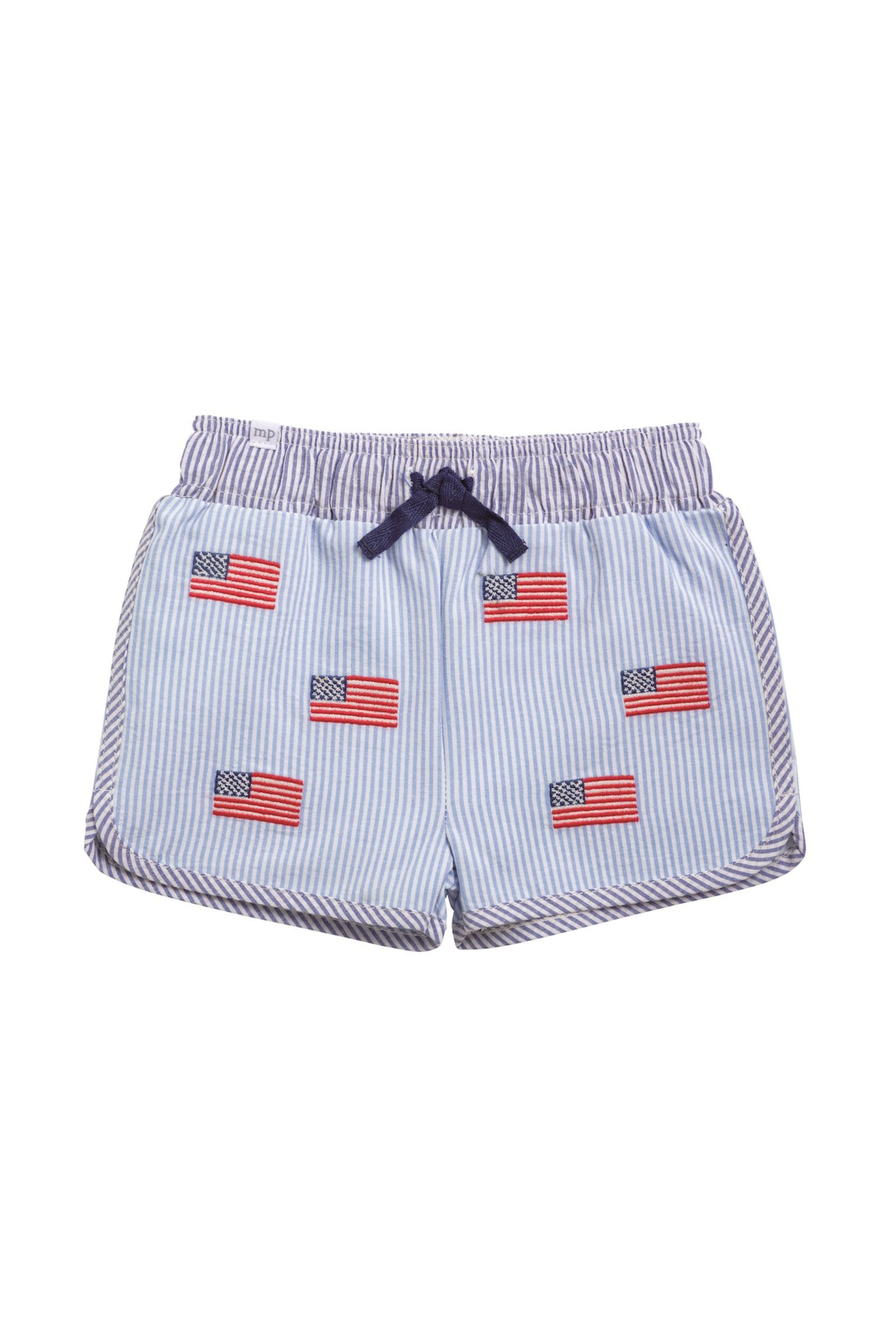 Classic and festive, the Flag Swim Trunks are a warm-weather staple for little ones. Crafted from lightweight blue-and-white seersucker, these shorts feature charmingly embroidered American flags throughout, adding a playful patriotic touch.