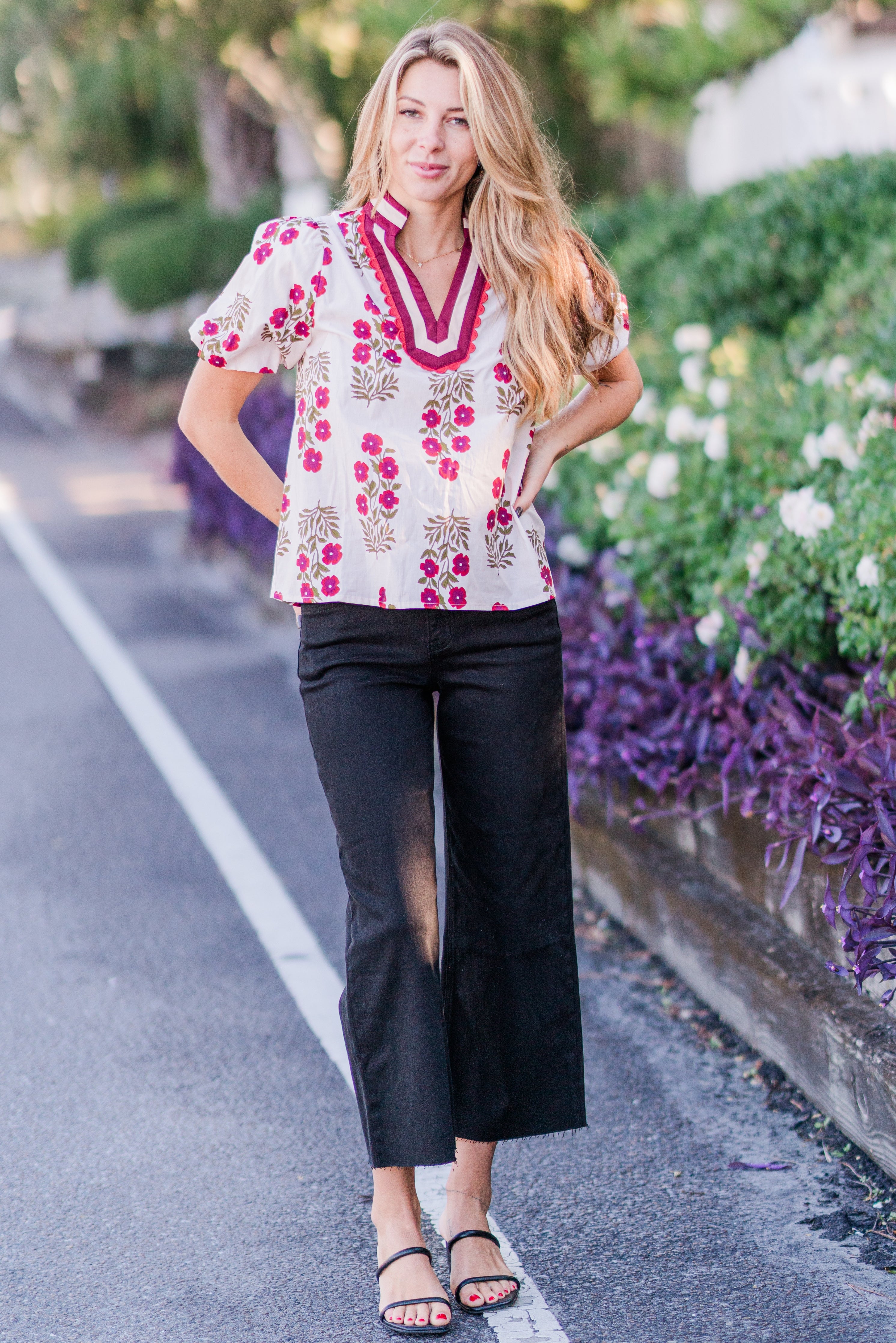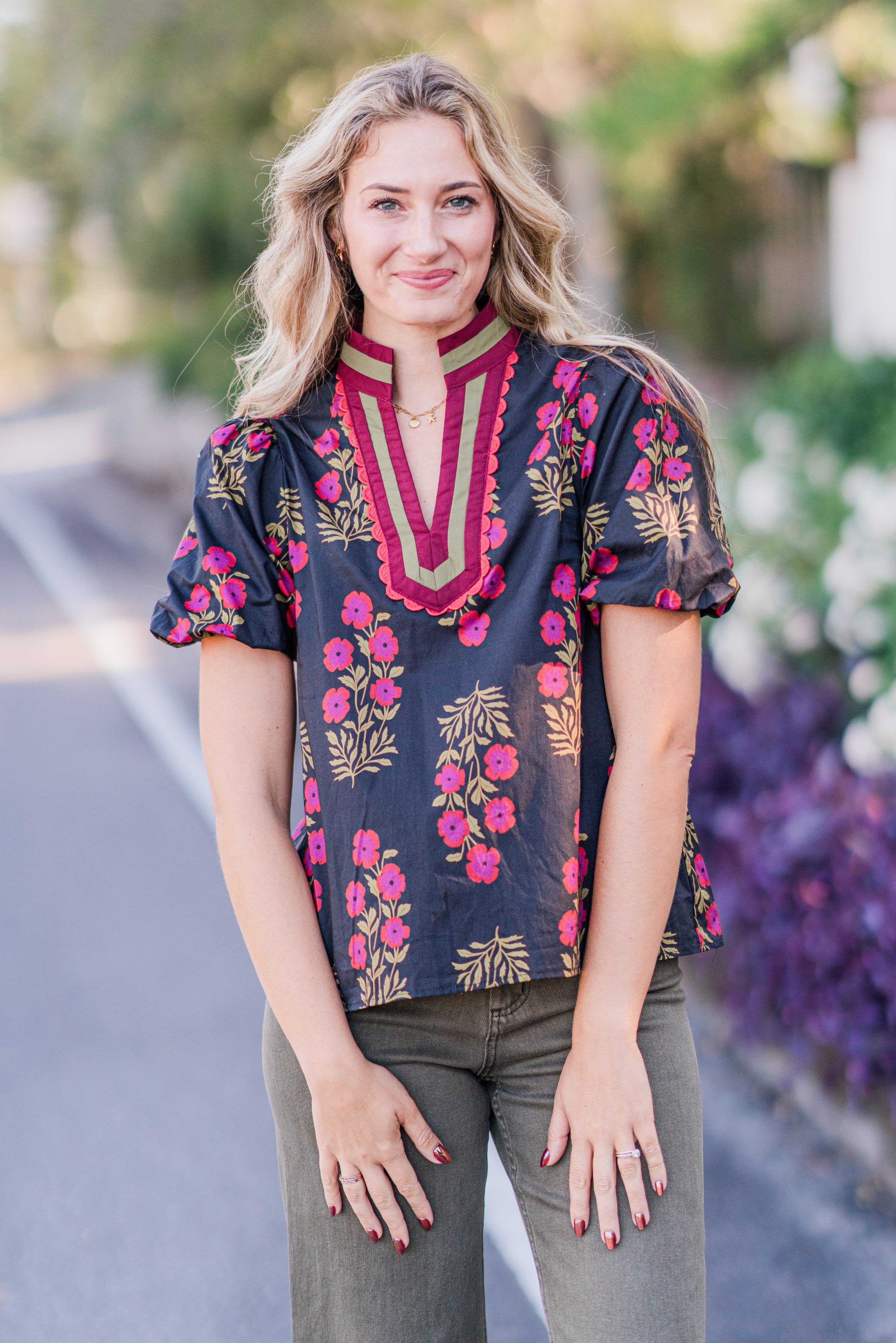 This floral print bubble sleeve top brings a touch of charm with its vibrant blooms and relaxed silhouette. Featuring a multicolor accent V-neck with a band collar and scalloped trim, it adds a playful yet polished detail to your look.