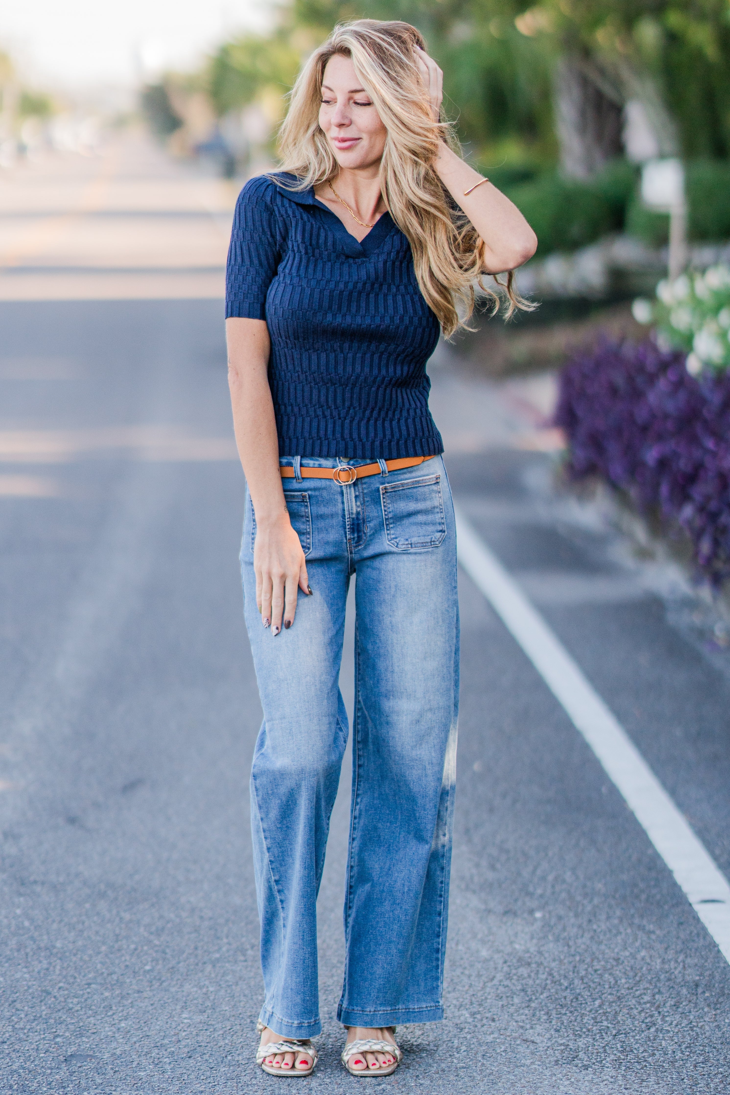 Timeless meets modern in this Ribbed V-Neck Polo Short Sleeve Top. Designed with a textured ribbed knit and a flattering V-neckline with a classic collar, it offers a polished yet comfortable fit.