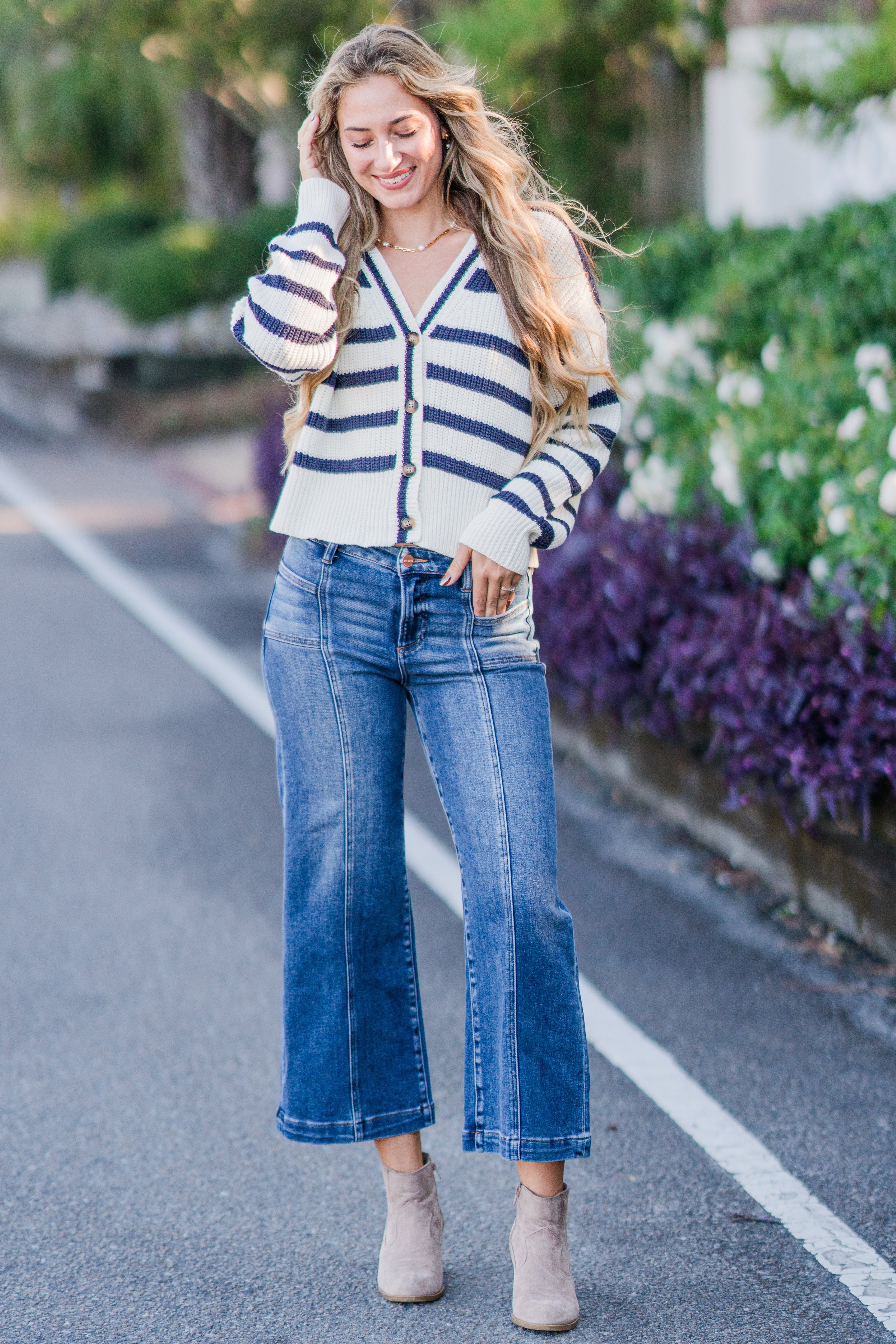 Stay cozy and stylish in this classic striped button-down cardigan. Featuring a relaxed fit, deep V-neckline, and bold navy and ivory stripes, it’s the perfect mix of timeless and trendy.
