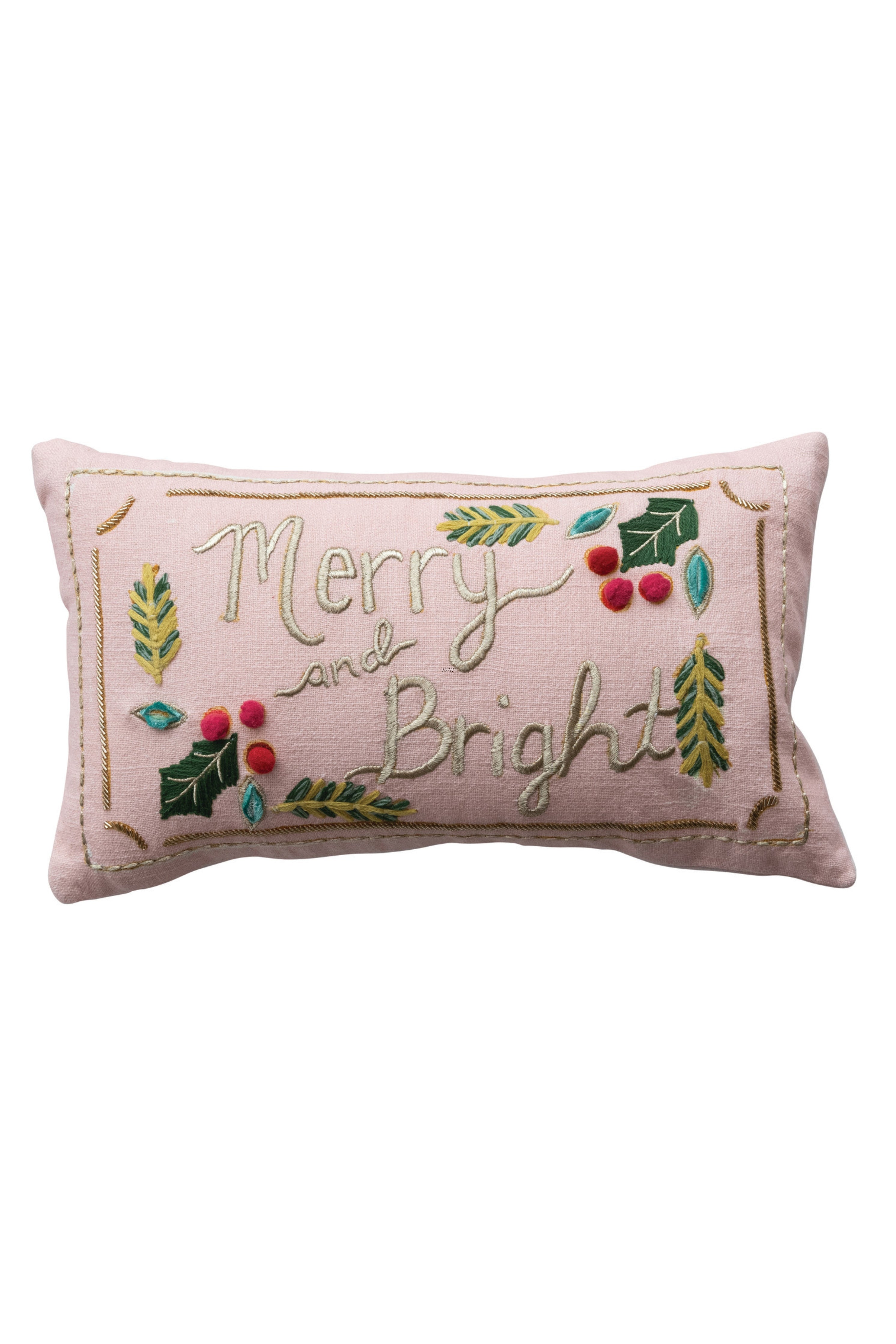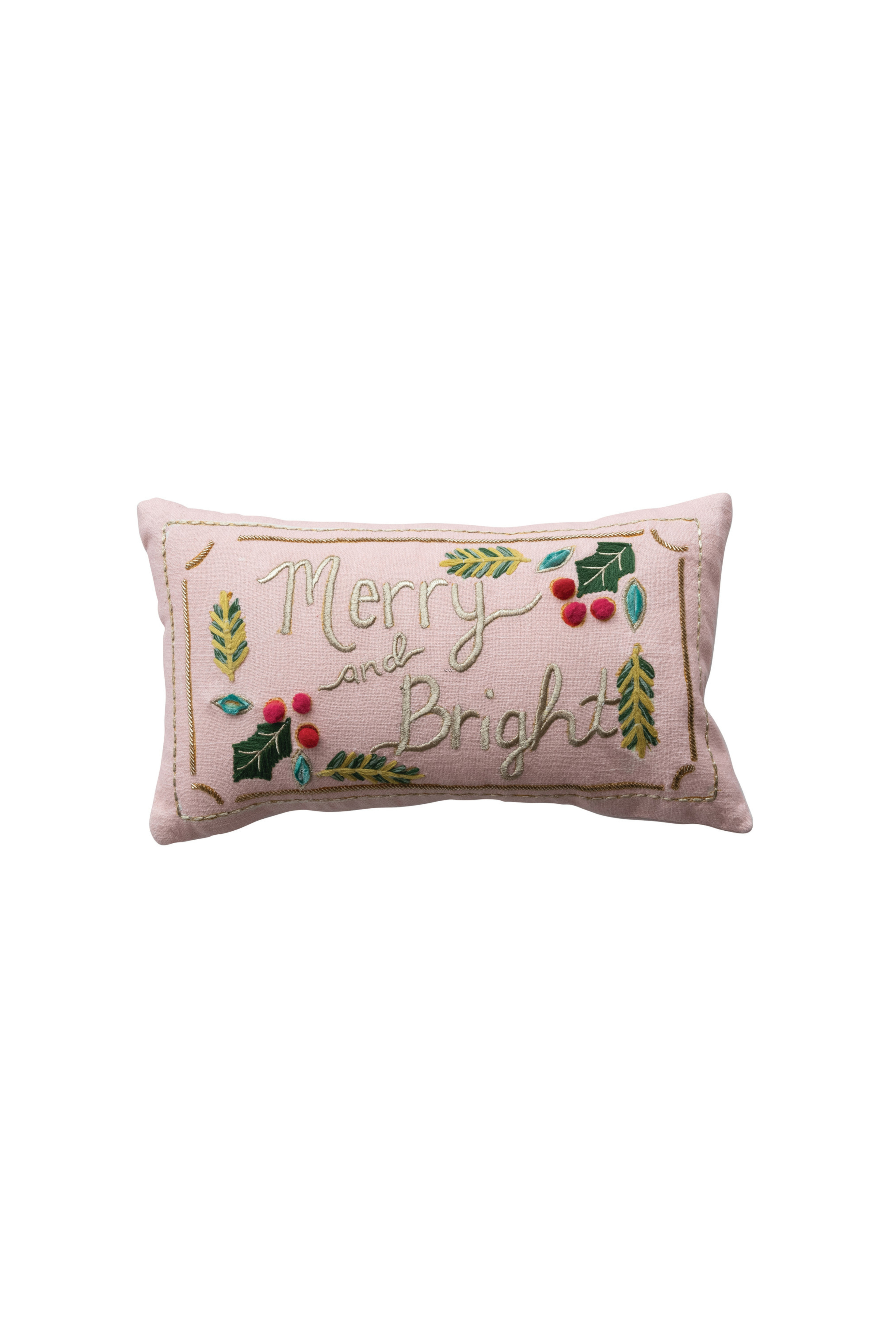 Bring cheerful charm to your holiday décor with this hand-embroidered lumbar pillow. Crafted from soft fabric, it features the festive phrase “Merry and Bright” surrounded by colorful stitched holly and leaf accents for a cozy, handcrafted touch.