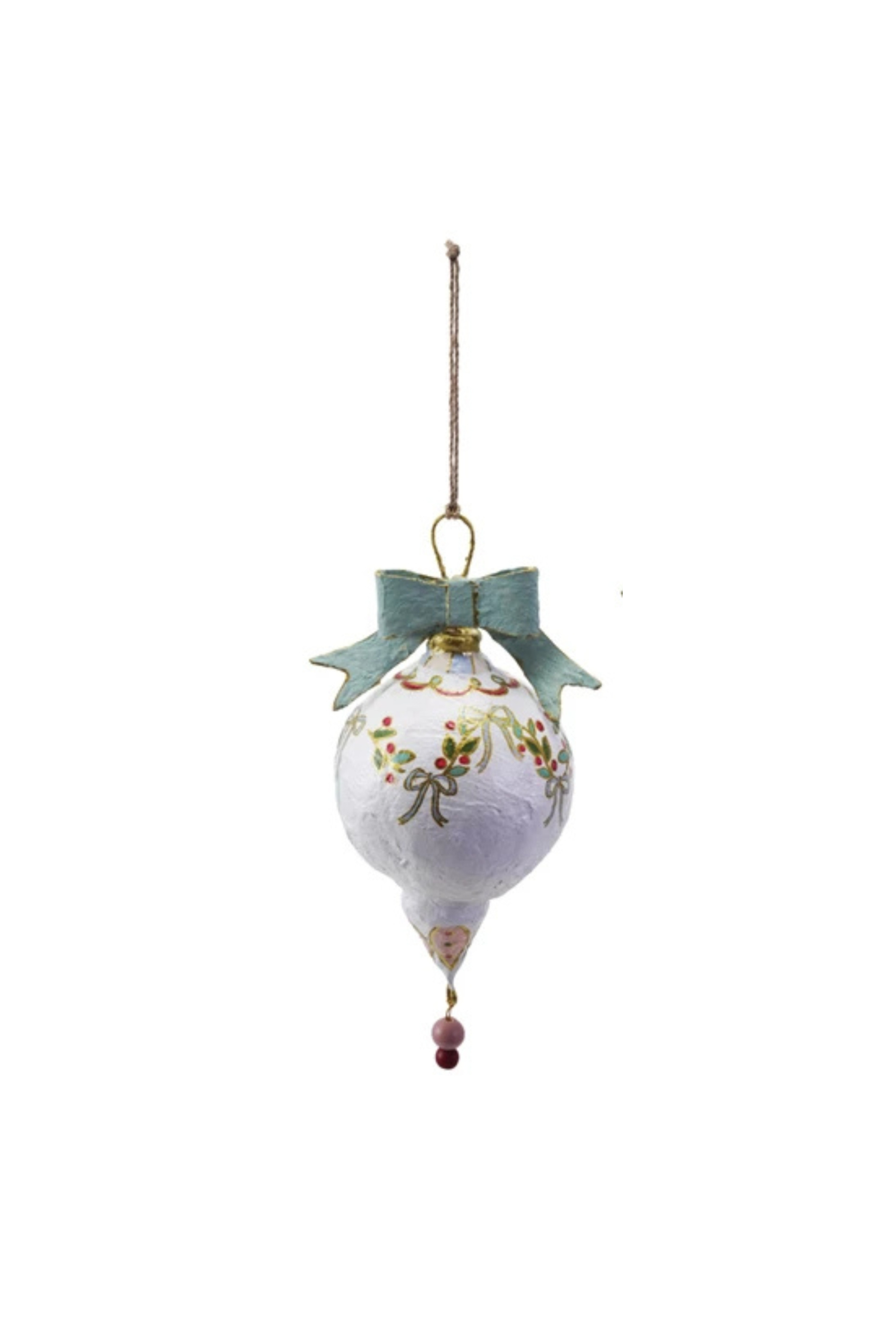 This Paper Mache Ornament with Bow brings handcrafted charm to your holiday tree. Featuring delicate painted details, a festive bow, and a whimsical phrase, it adds a nostalgic touch to your seasonal décor.