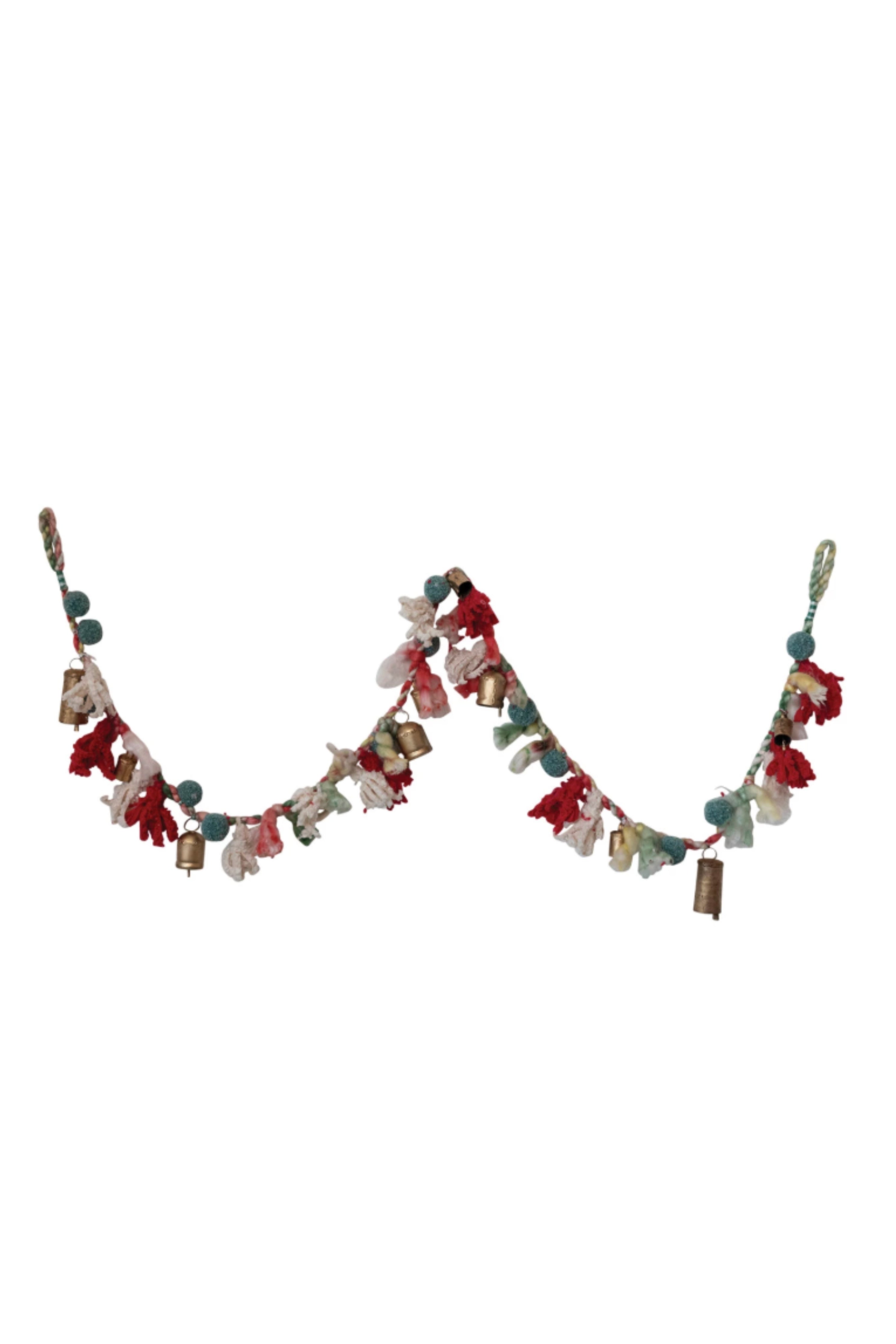 This handmade wool and cotton blend garland is a celebration of artisanal craftsmanship and vintage aesthetics. Each element, from the soft pom poms to the jingling metal bells, is a nod to the joyous moments of yesteryear.