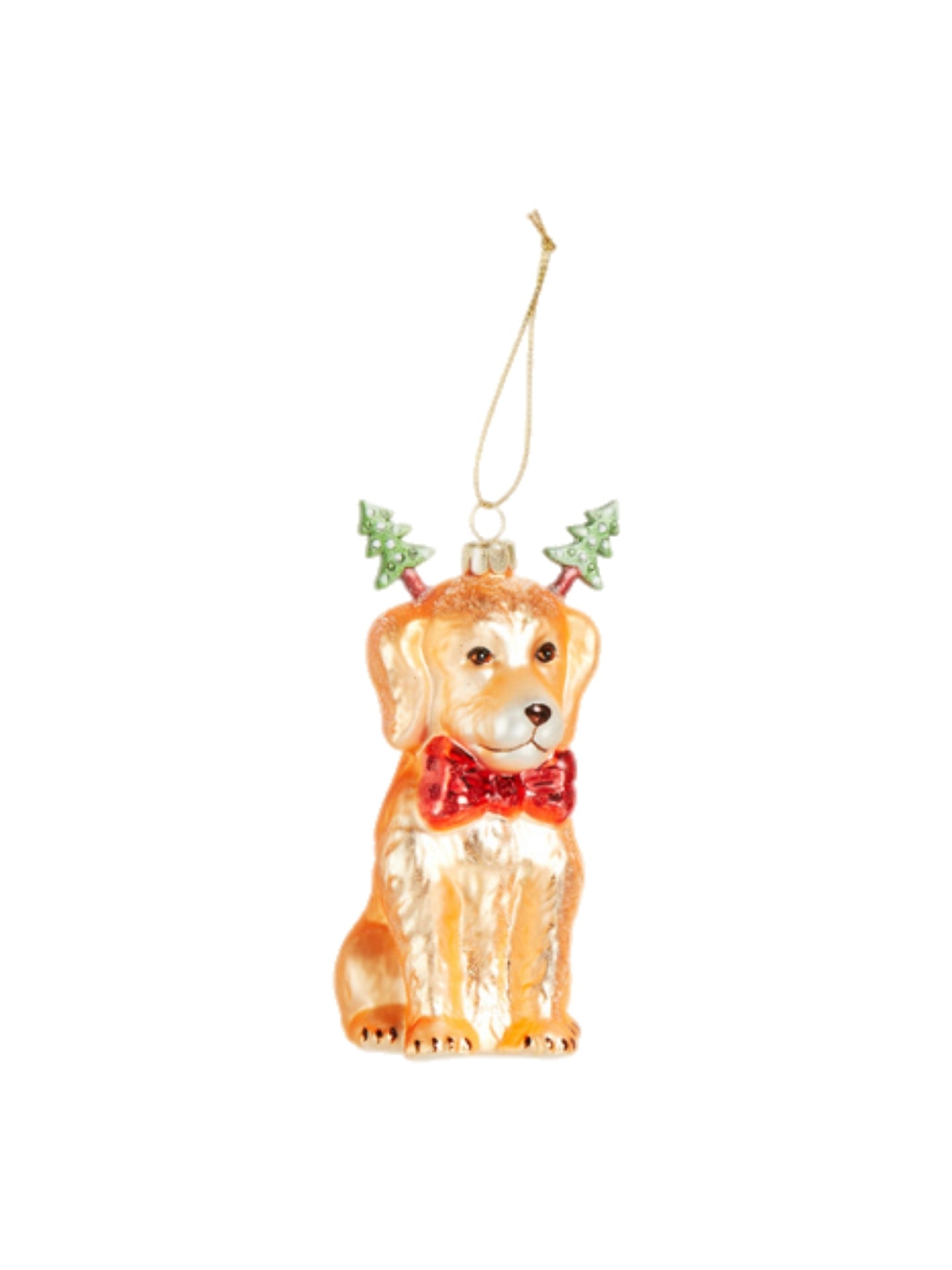 The Christmas Pup Ornament features adorable dogs dressed in festive attire, including reindeer antlers, scarves, and Santa hats. Hand-painted with delightful details, each pup brings charm and holiday cheer to your tree.