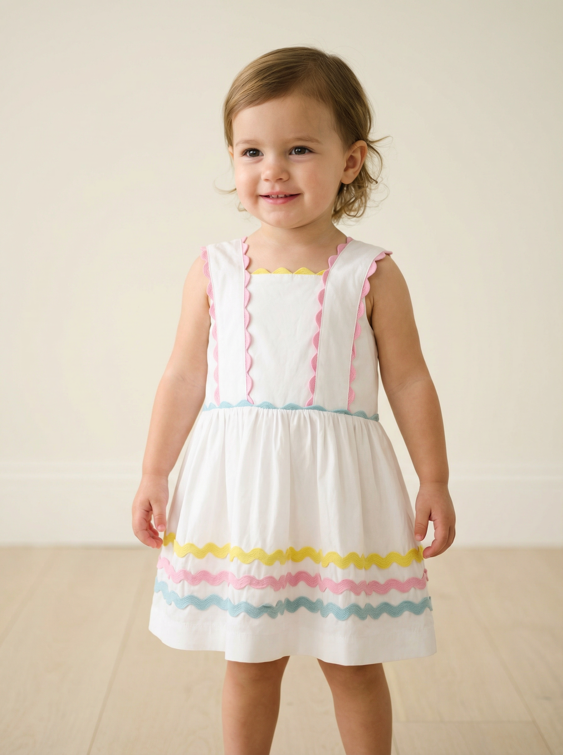 Add a playful touch to her wardrobe with this Ric-Rac Poplin Dress. Crafted from crisp poplin, this sleeveless apron-style dress is beautifully accented with colorful ric-rac trim throughout, creating a charming, vintage-inspired look. Lightweight and breathable, it’s perfect for spring celebrations, Easter gatherings, and everyday twirling moments.