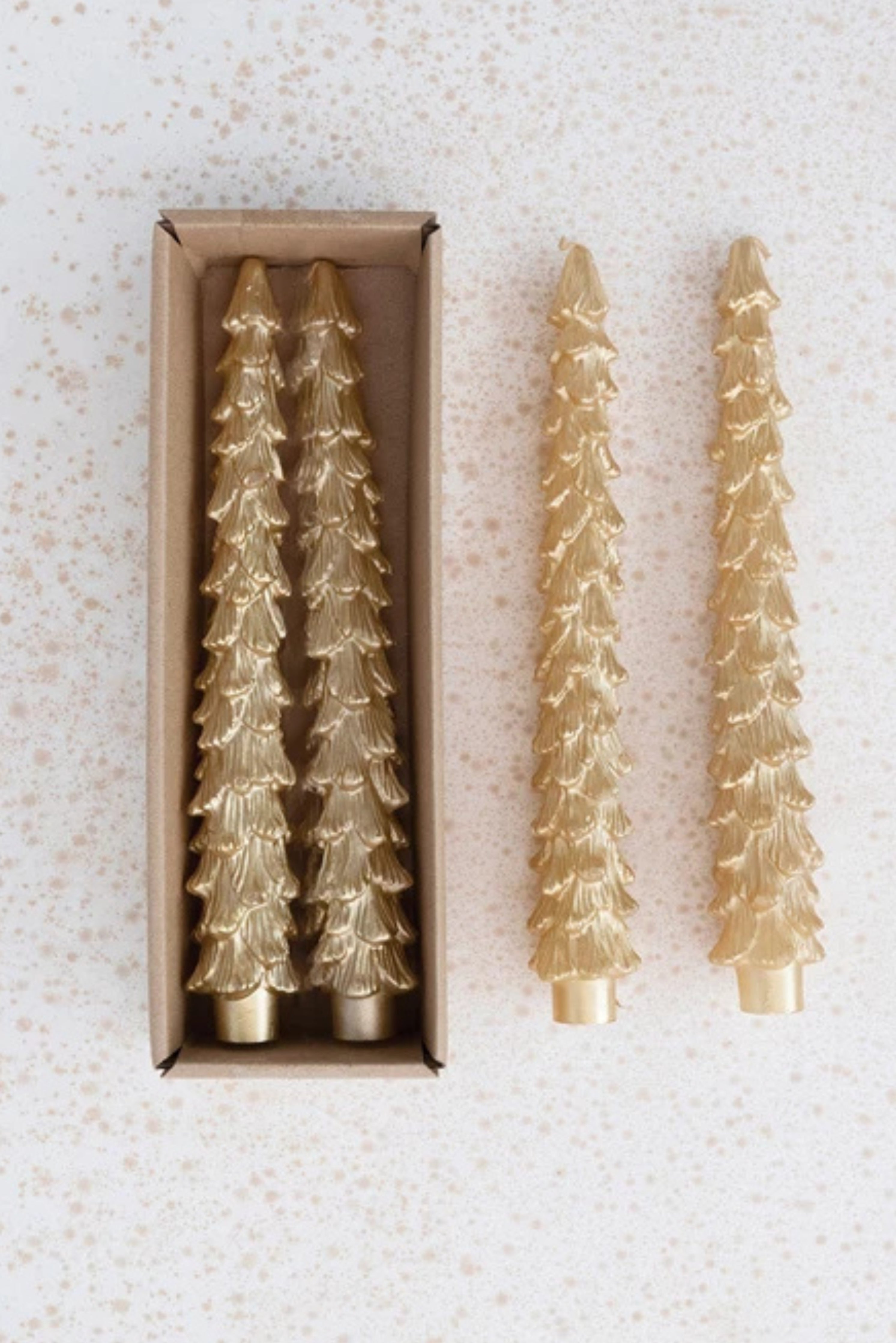 Mix and match the festive hues and sculptural silhouettes of our artfully crafted totems and tapers for a refined candlelight arrangement on a dining table or mantelpiece. Gold color; Set of 2.