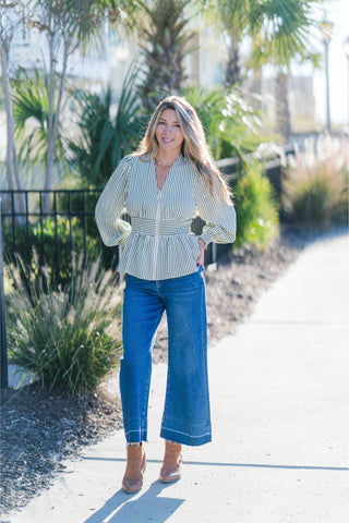 Striped Long Sleeve Boat Neck Top with Button Detail