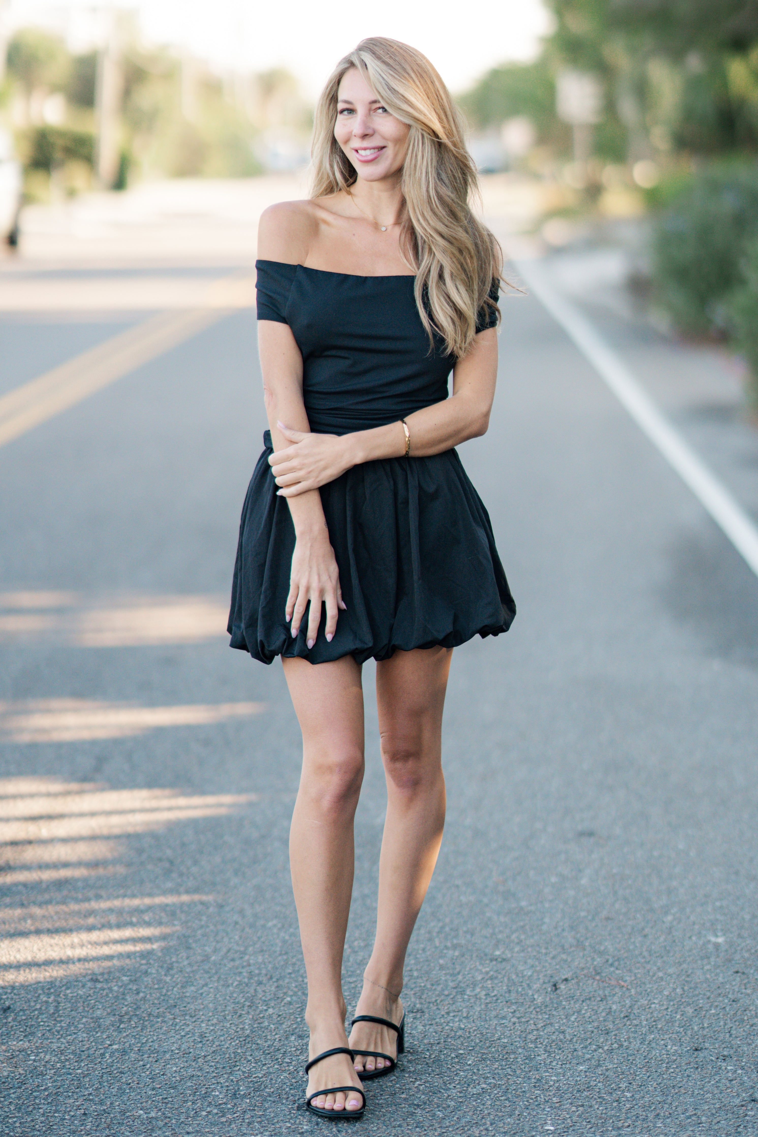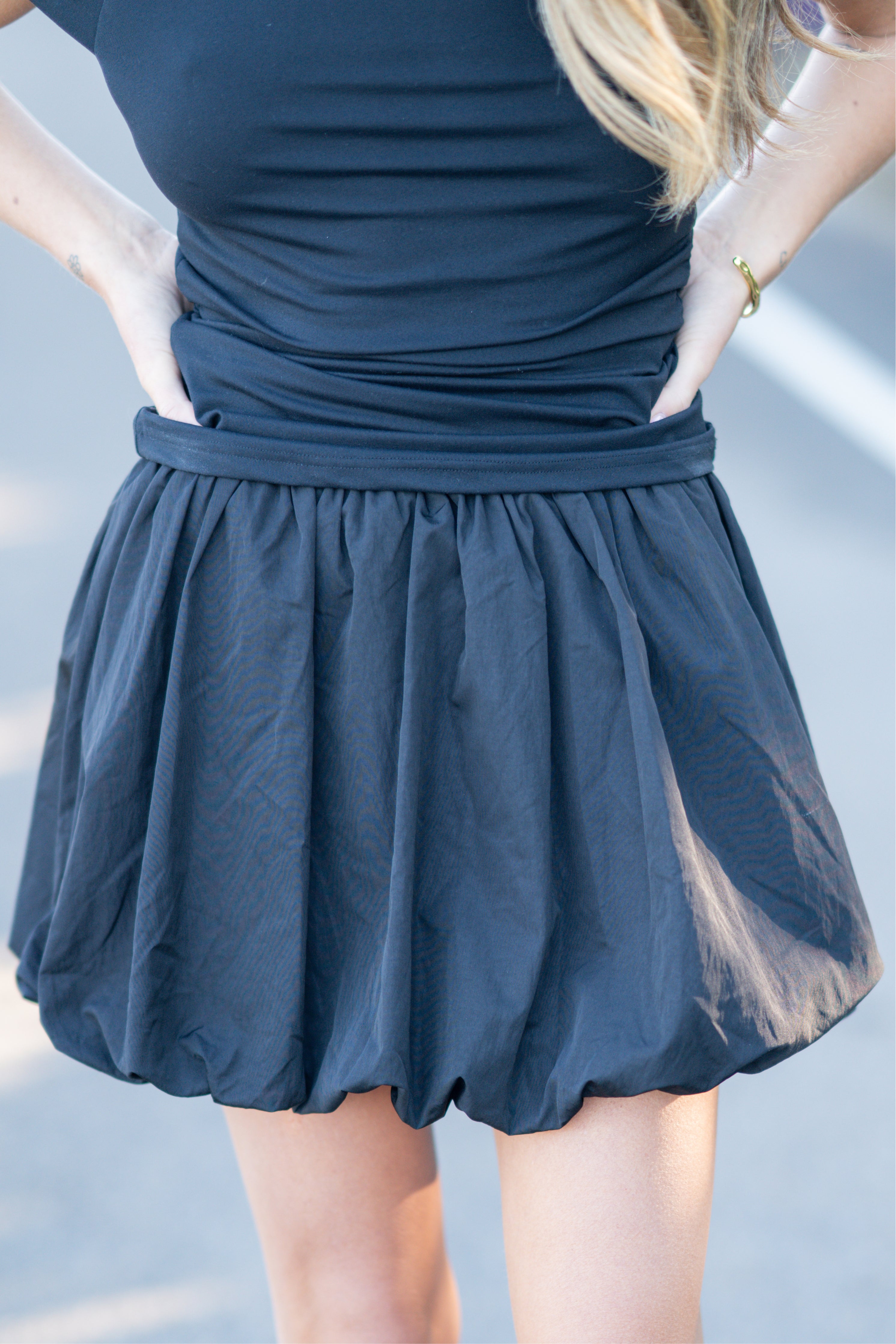 This black bubble mini skirt brings playful volume with its gathered hemline and flattering high-waisted fit. Designed with lightweight fabric, it adds a bold yet versatile touch to your everyday or evening looks.