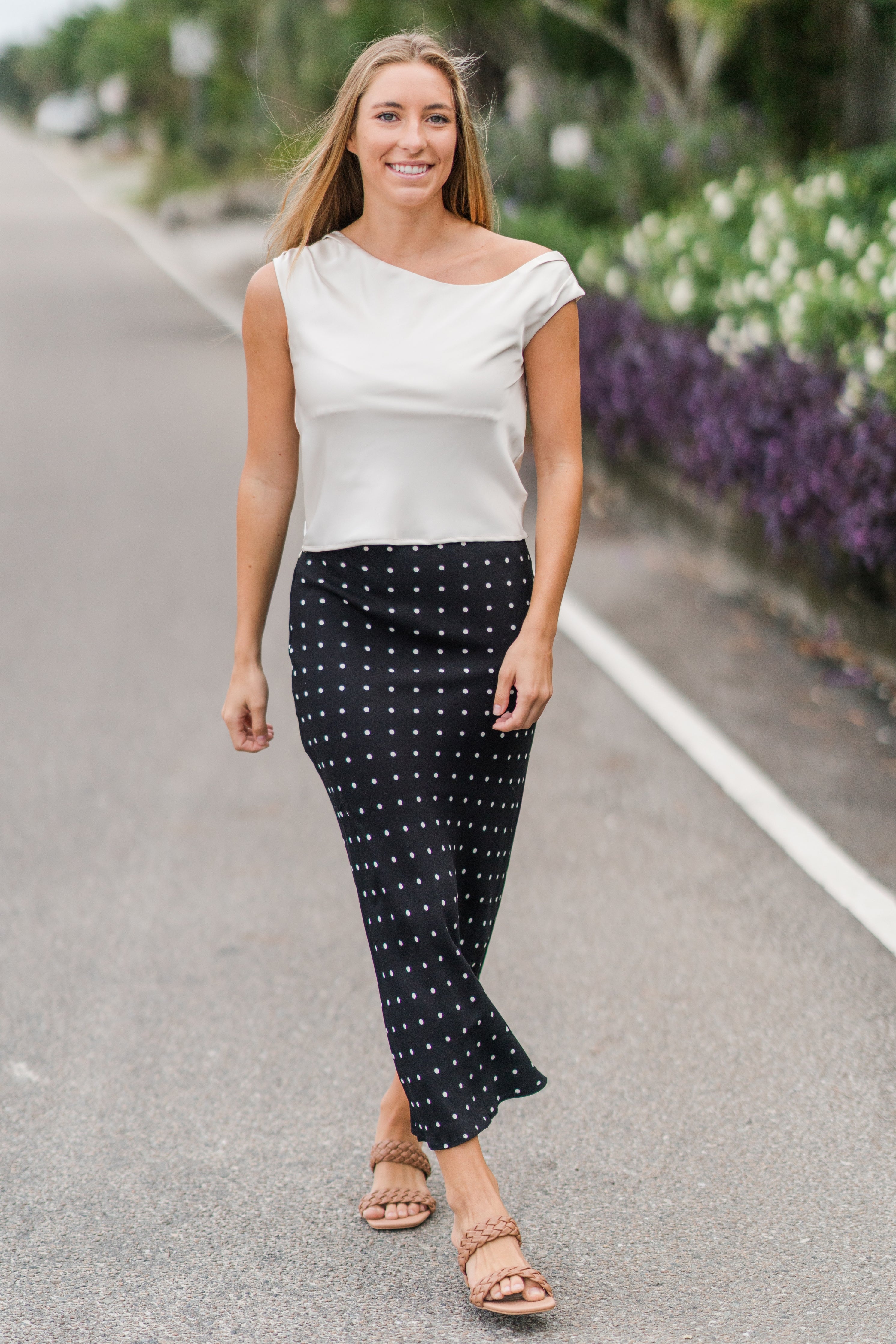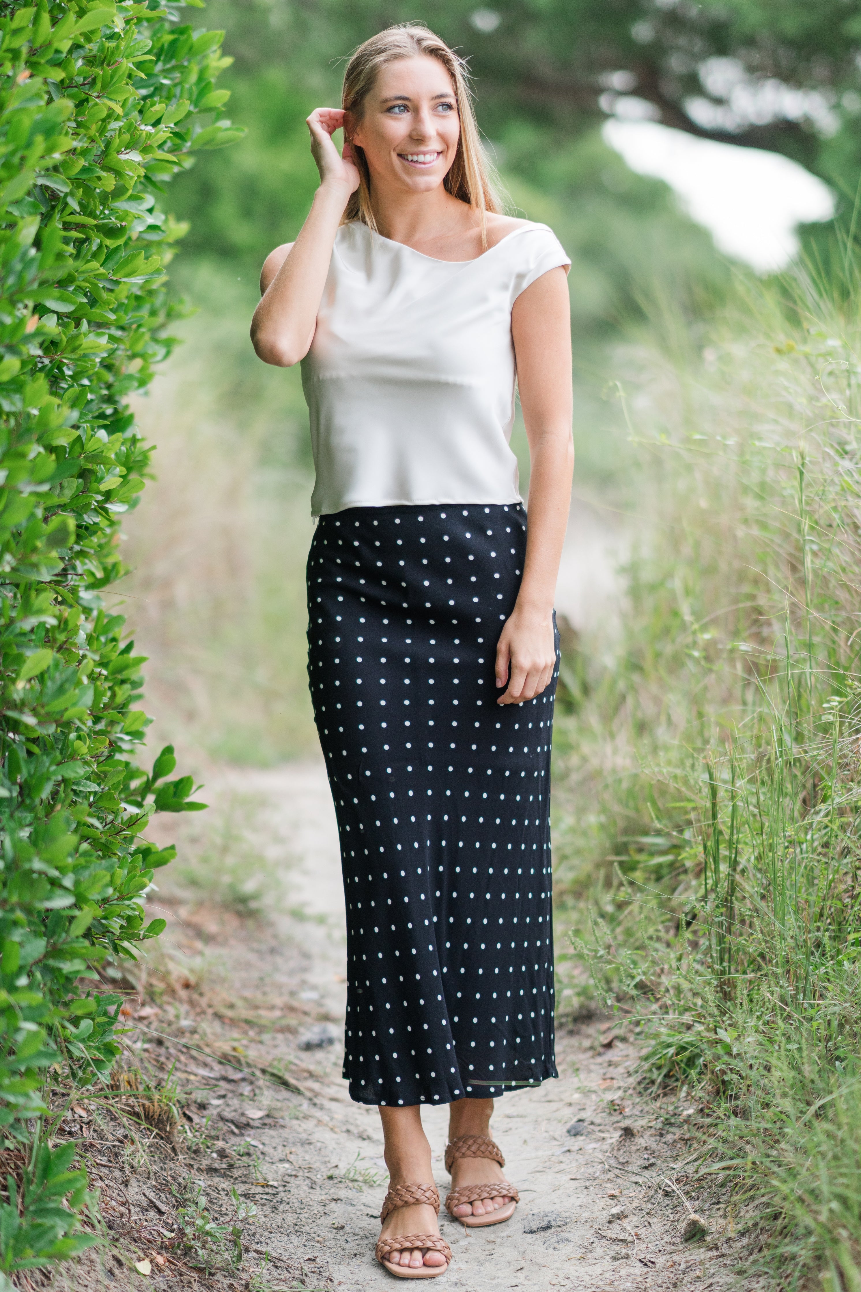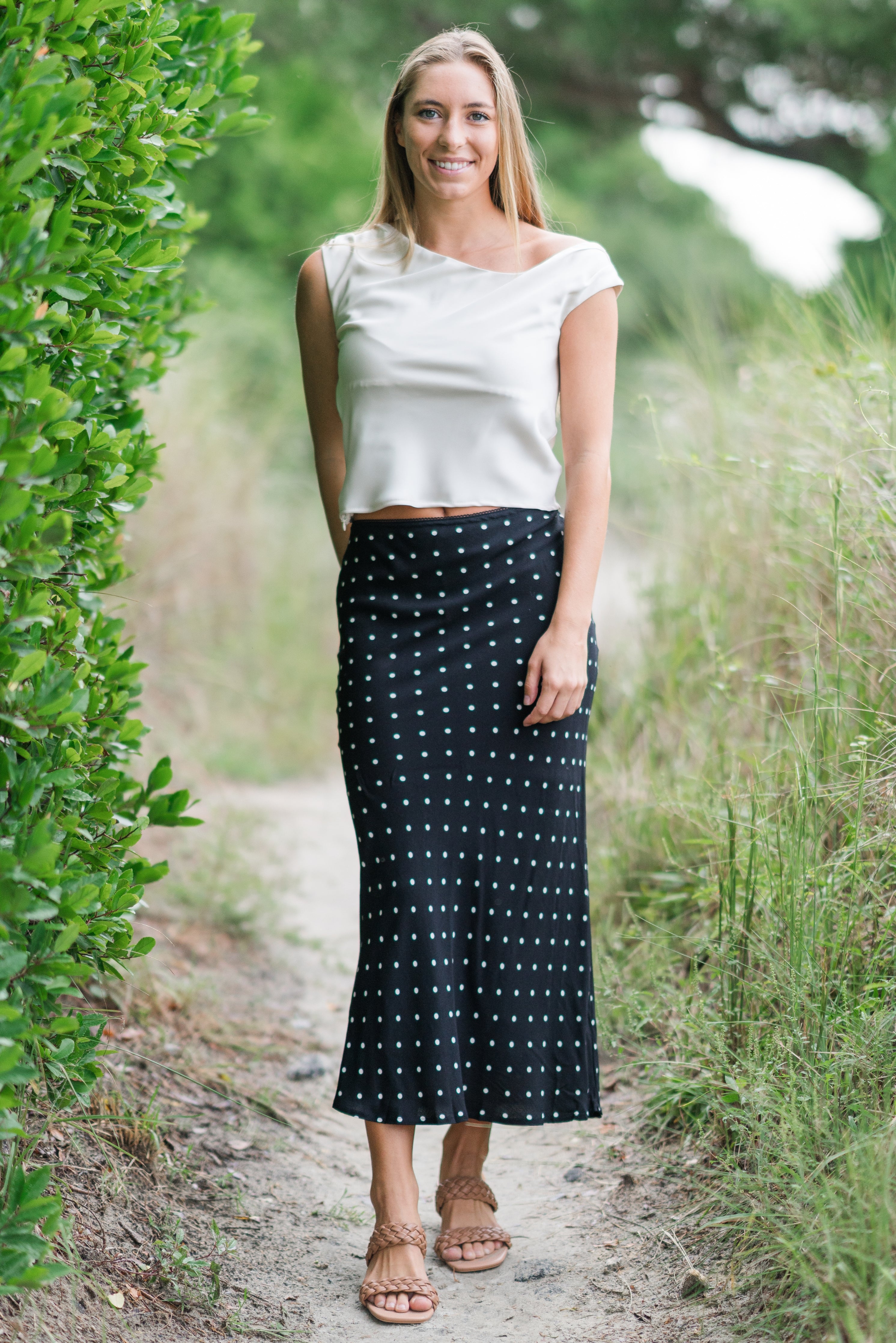 Add timeless charm to your wardrobe with this Polka Dot Slip Skirt. Featuring a flattering straight silhouette with a subtle drape, this versatile piece effortlessly transitions from casual days to chic evenings. Pair it with boots, sneakers, or heels for endless styling options.