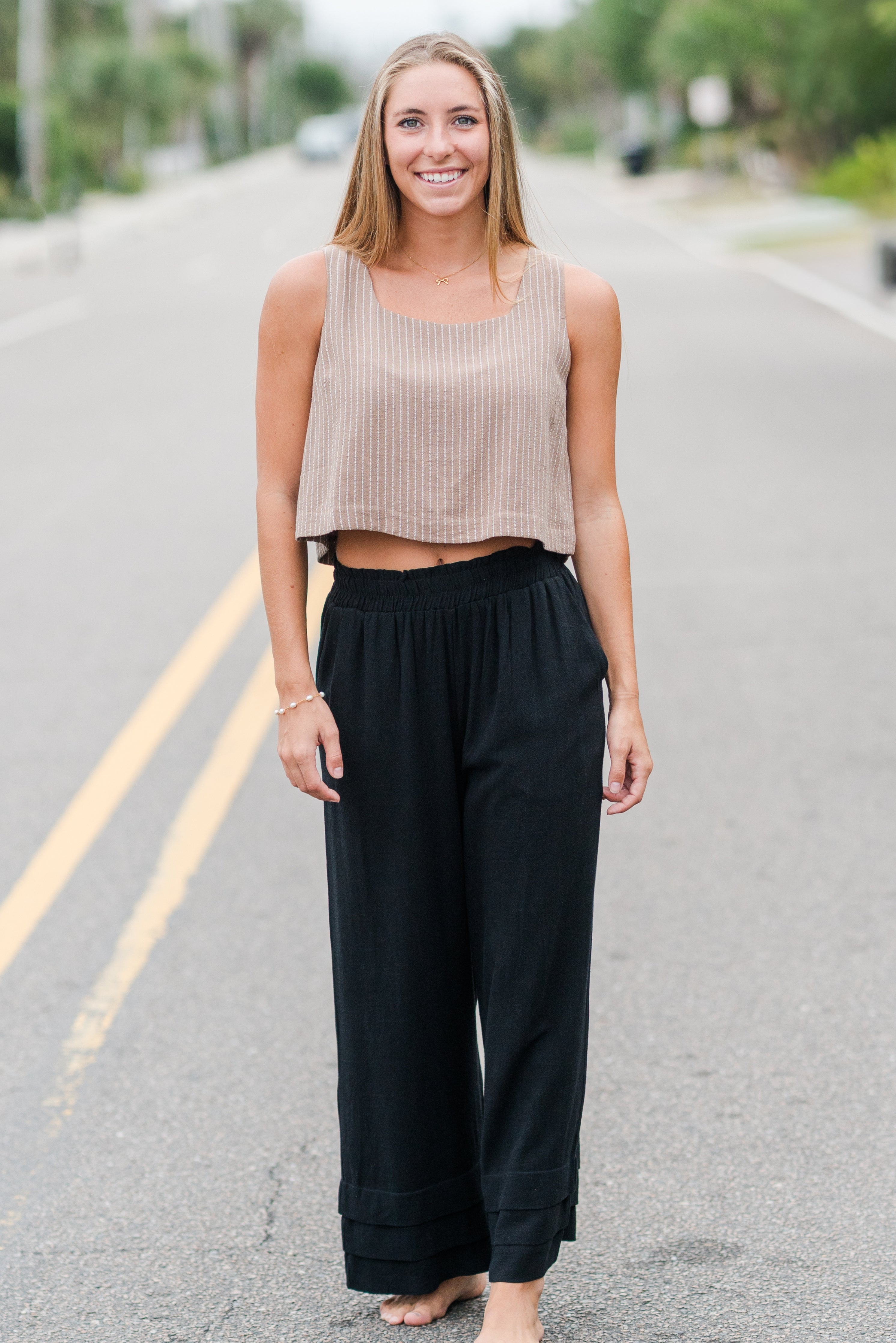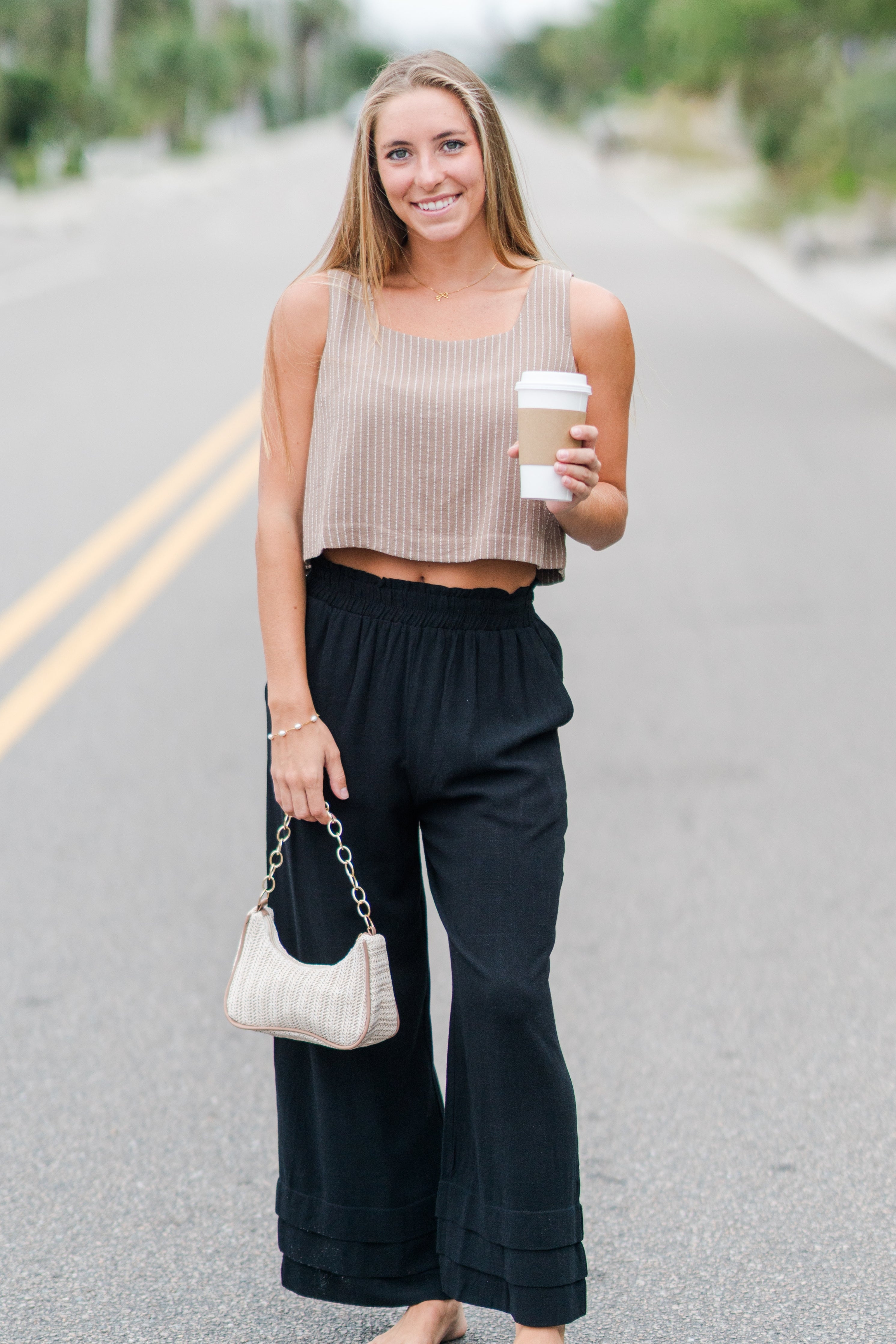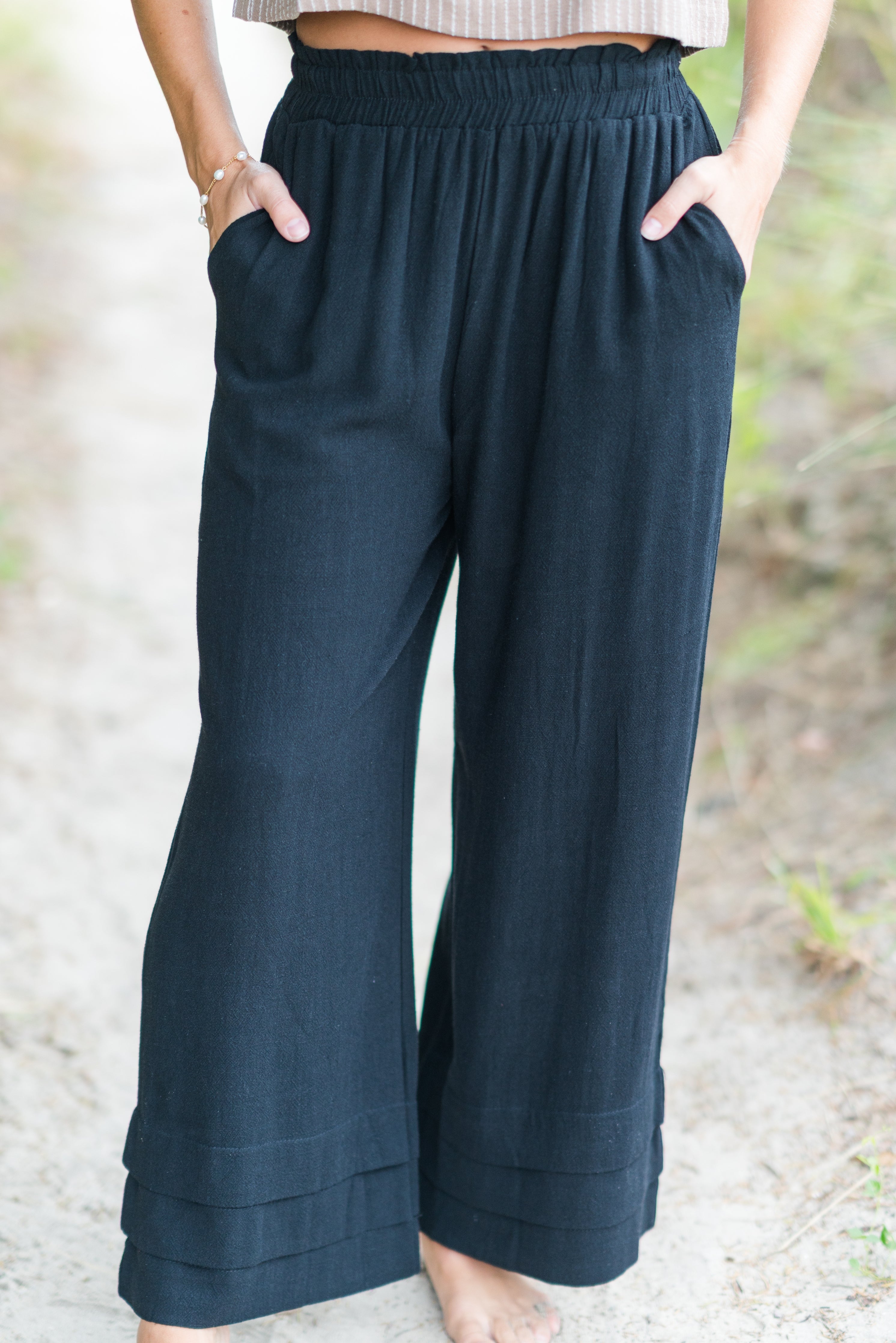These black ruffle ankle pants bring a modern twist to a classic wide-leg silhouette. Designed with a comfortable elastic waistband and tiered ruffle detailing at the hem, they balance effortless style with a touch of sophistication.