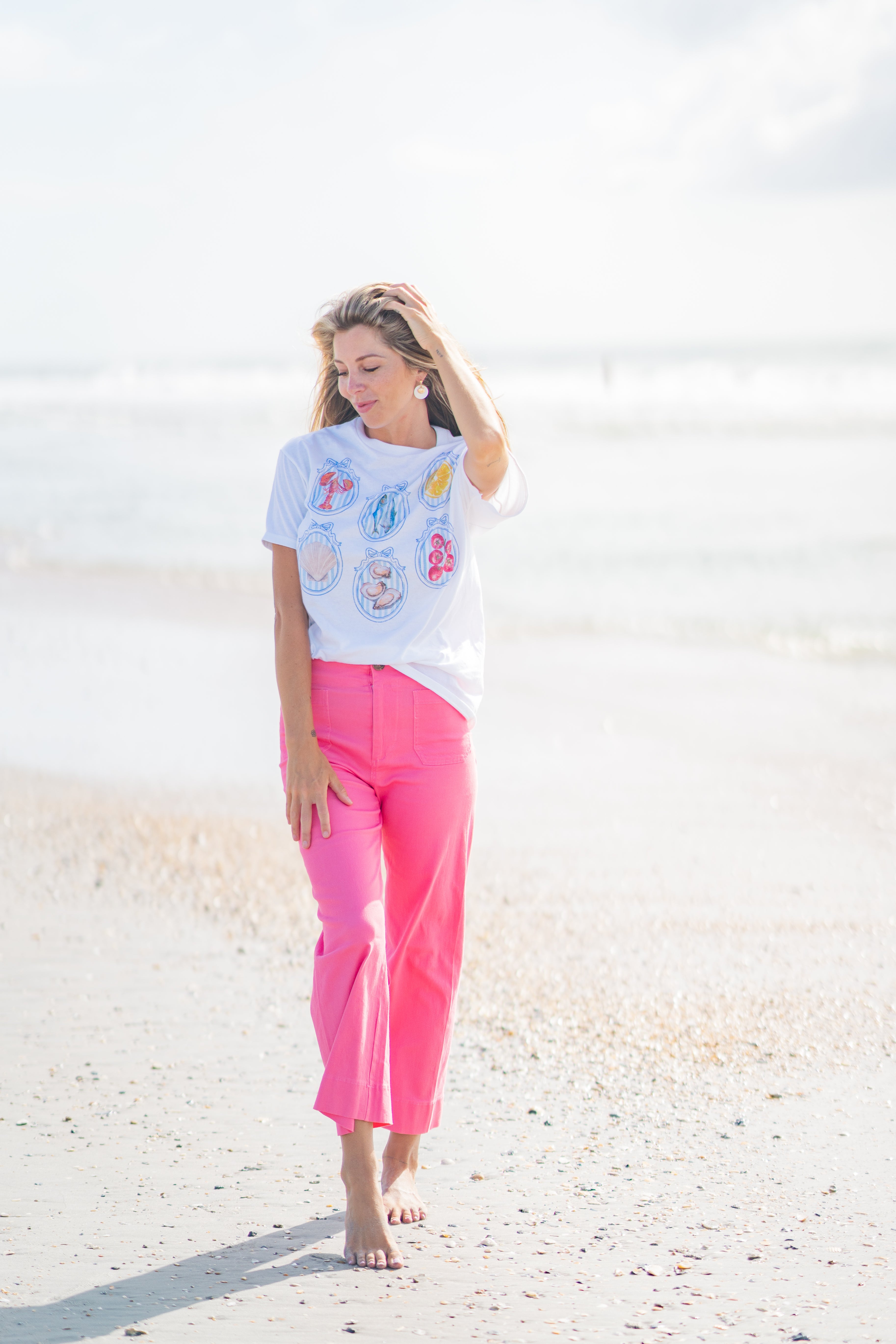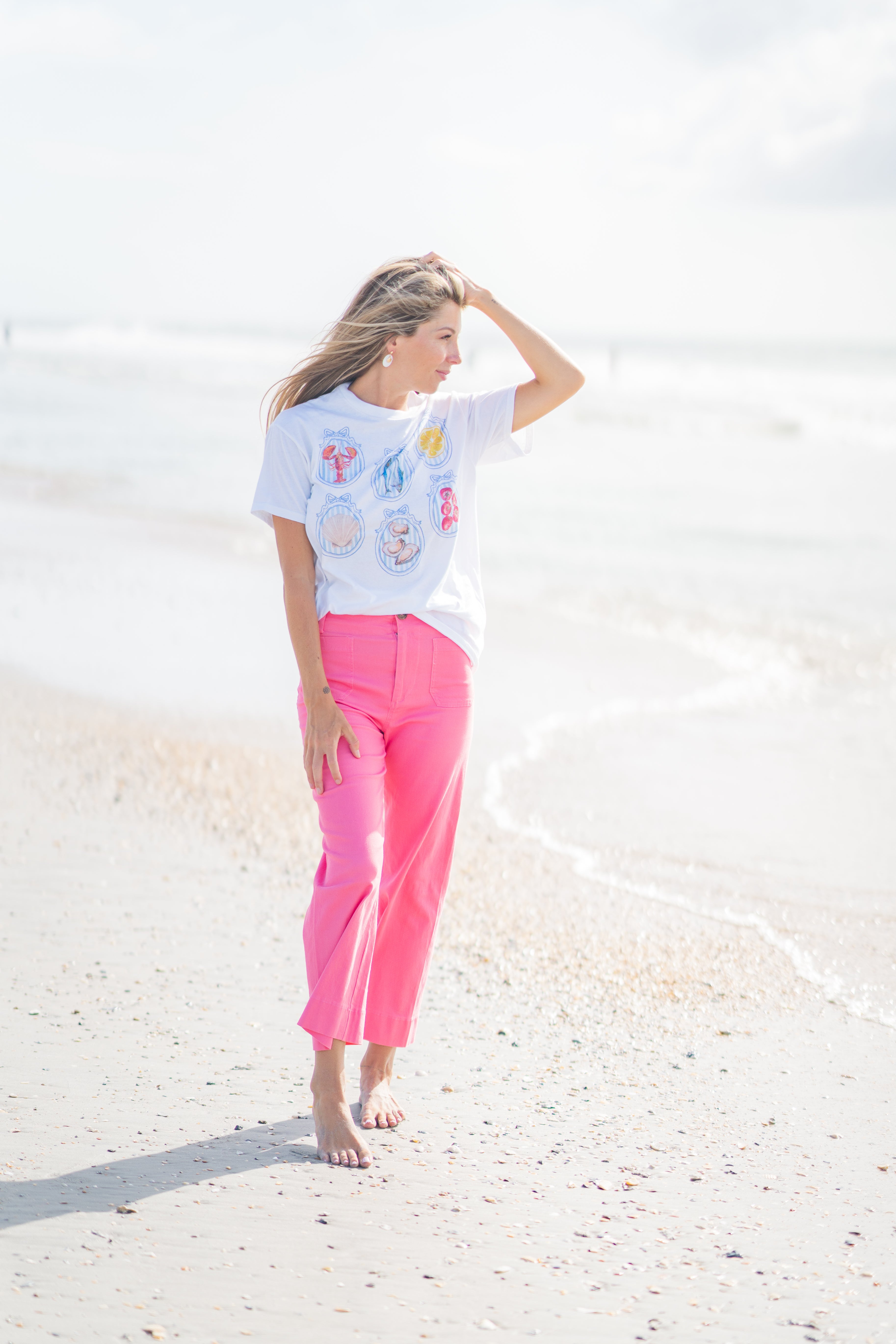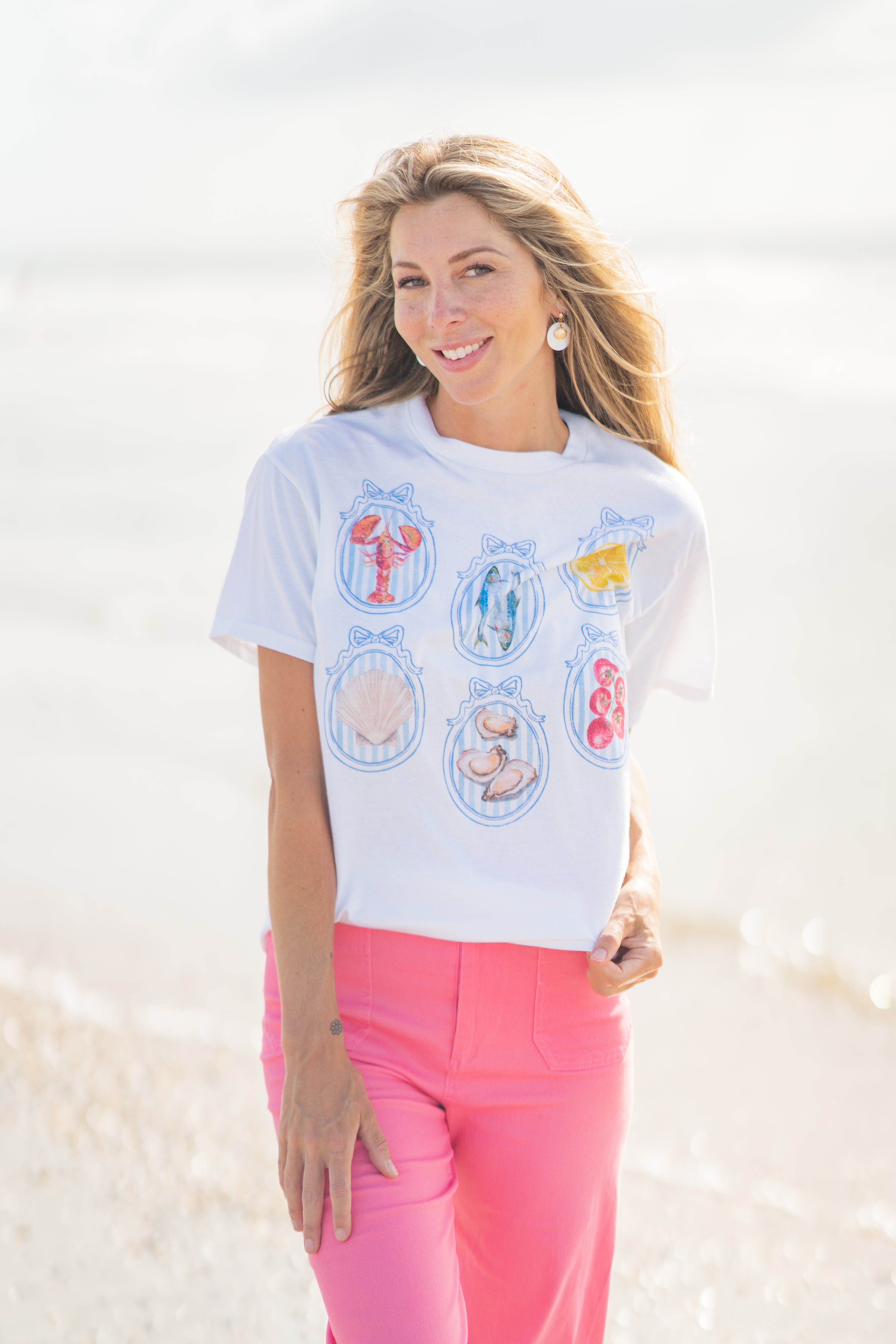 Channel coastal charm with this Summer Diet Graphic Tee, featuring vintage-style frames showcasing seafood and summer produce. The soft cotton and relaxed fit make it your go-to for beach days, market strolls, or lounging in style. Pair with drawstring shorts or denim cutoffs for a laid-back look with a pop of personality.
