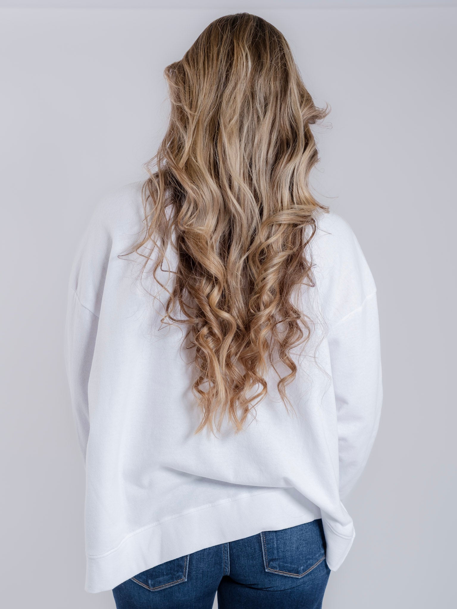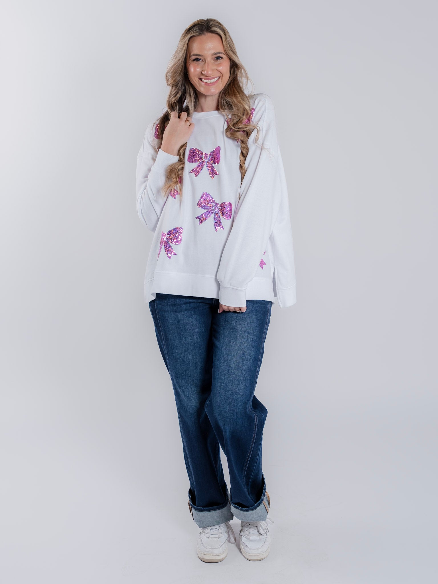 Bring on the charm with our Bow Sparkle Sweatshirt, featuring playful pink sequin bows scattered across a soft white base. Its oversized fit and dropped shoulders make it an easy go-to for cozy mornings or casual outings. Pair it with denim or leggings for a look that’s both fun and effortless.