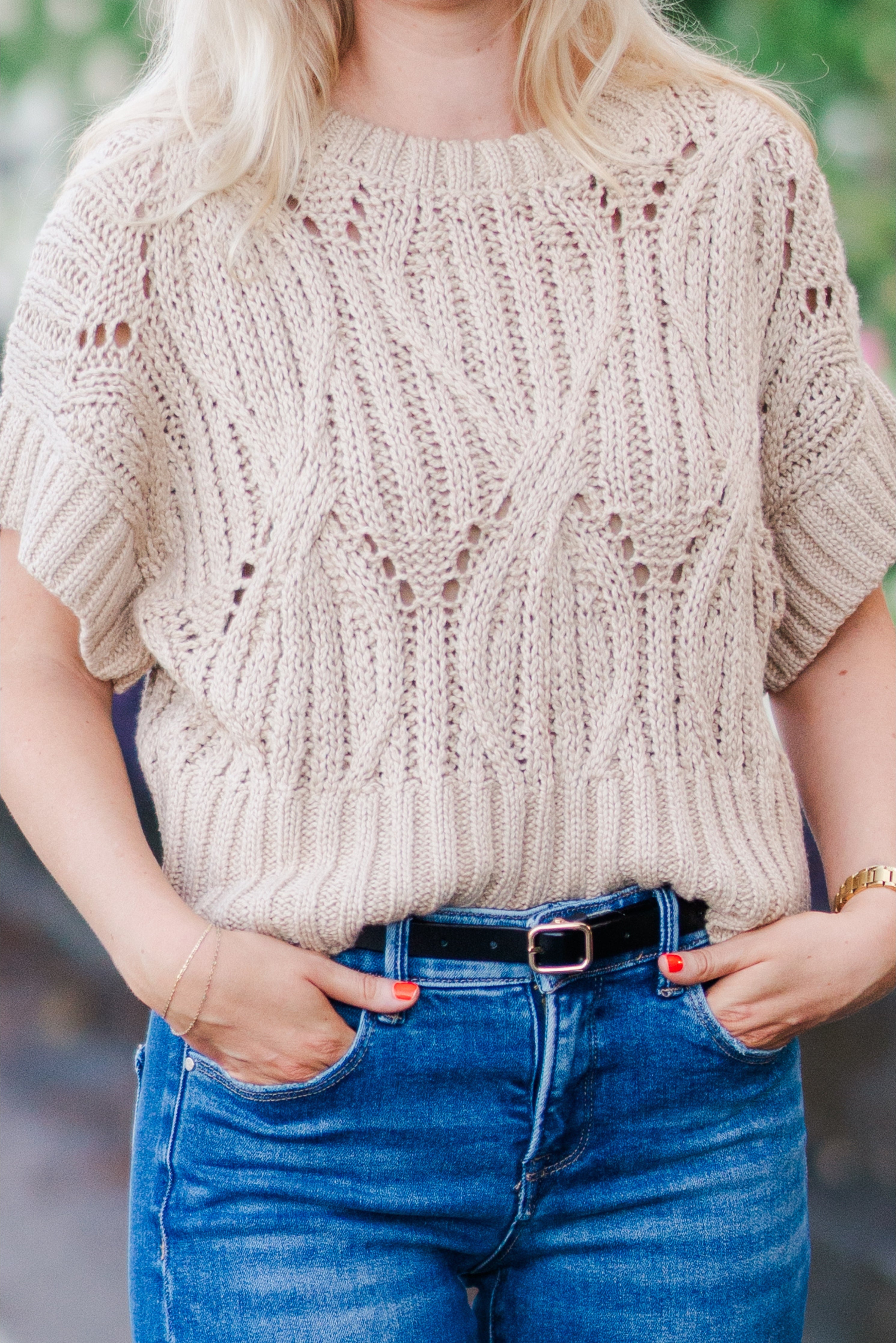 Cozy meets chic in this Cable Knit Sweater Top, designed with intricate textured patterns and an easy, relaxed fit. The short sleeves and wide neckline make it perfect for layering or wearing solo through transitional seasons.