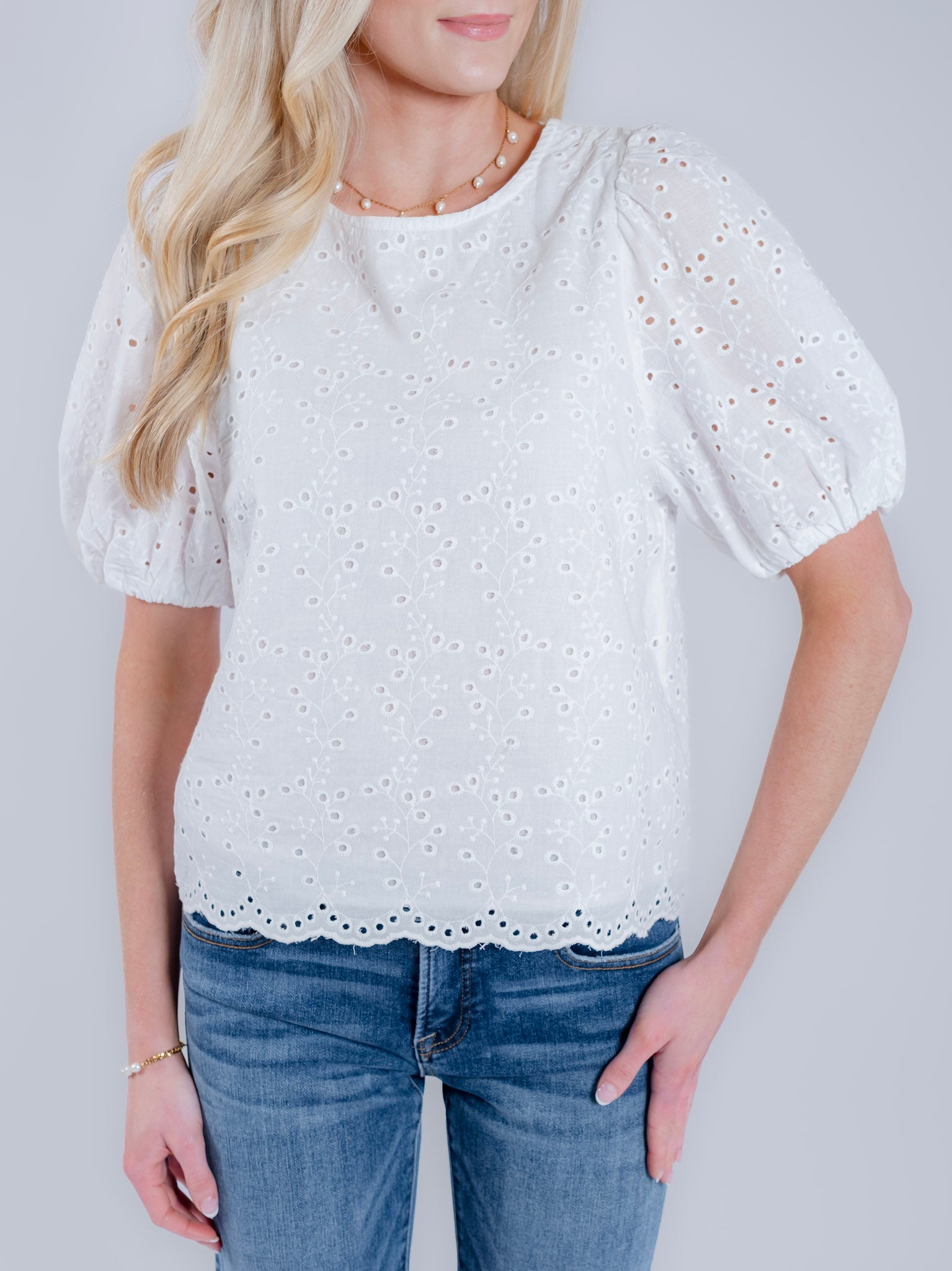 This eyelet-embroidered blouse features delicate eyelet detailing throughout with softly puffed sleeves for a feminine silhouette. Designed with a relaxed fit and a classic round neckline, it’s finished with a scalloped hem that adds subtle texture.