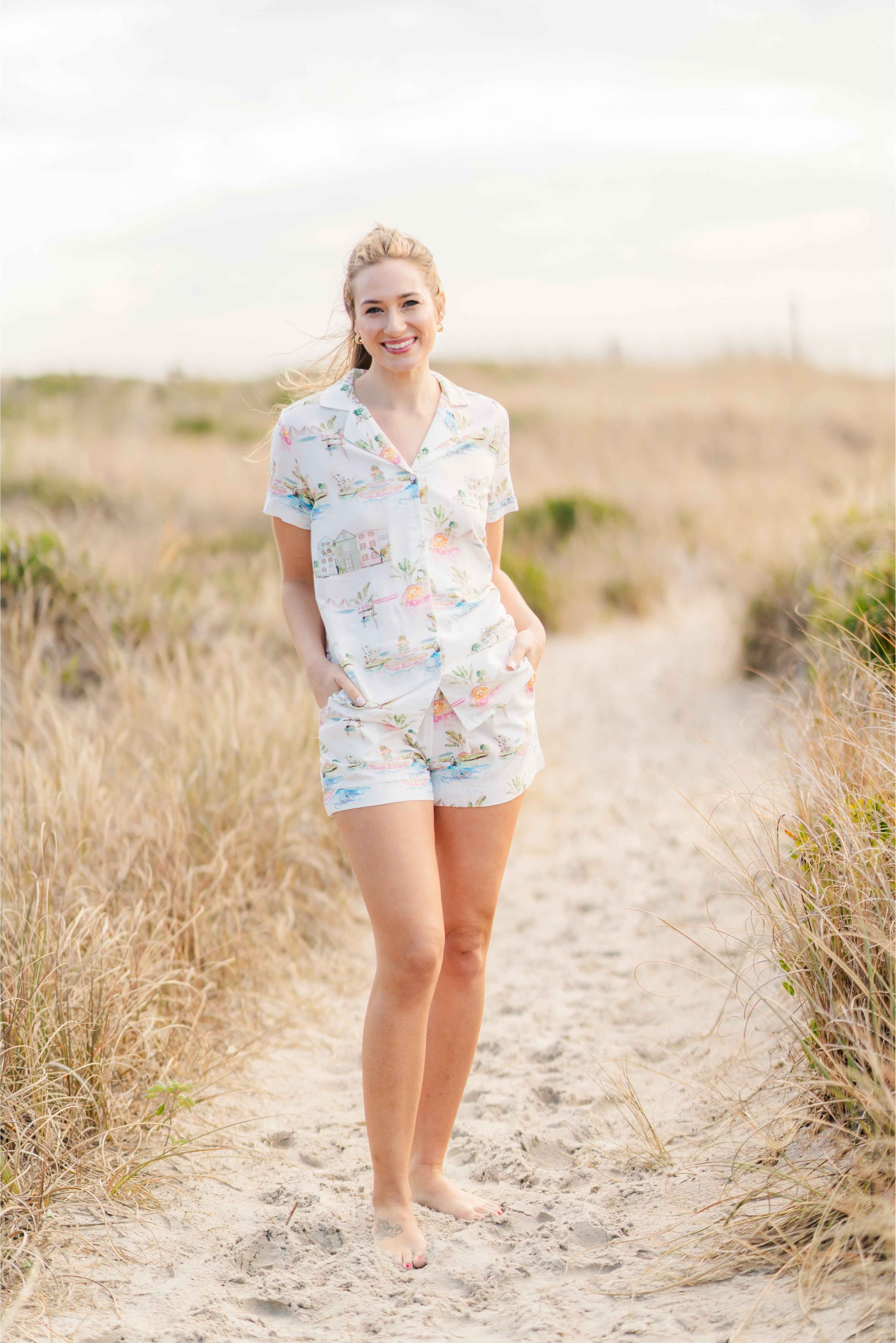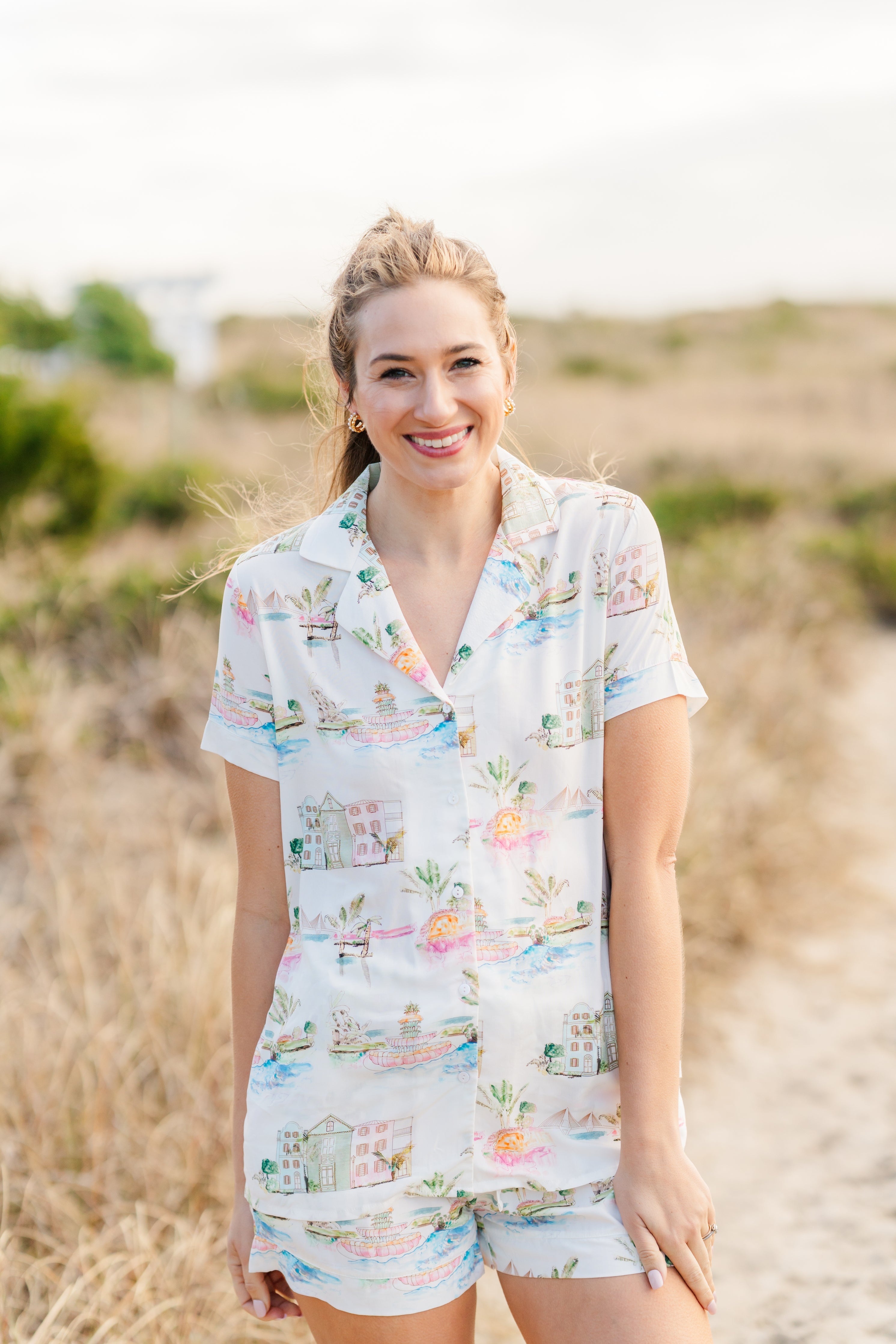 Show your love for the Holy City with these charming pajama top! As an ode to beloved Charleston, this delightful design captures the essence of our South Carolina hometown with colorful illustrations of iconic local landmarks and timeless details.