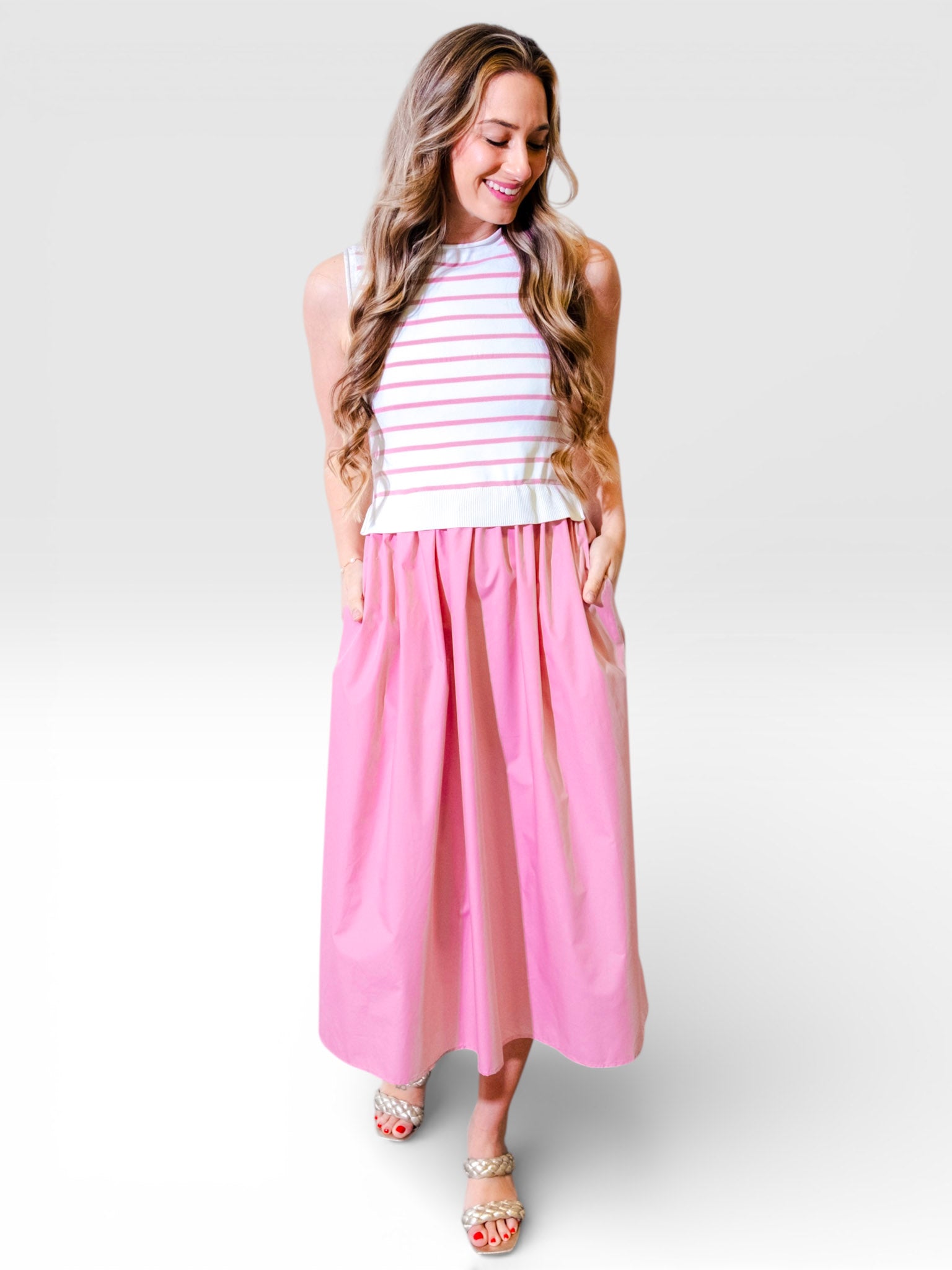This pleated midi dress features a fitted striped bodice paired with a soft, flowy skirt for an effortlessly polished look. Designed with a flattering silhouette and comfortable fit, it’s perfect for brunch, events, or warm-weather outings.