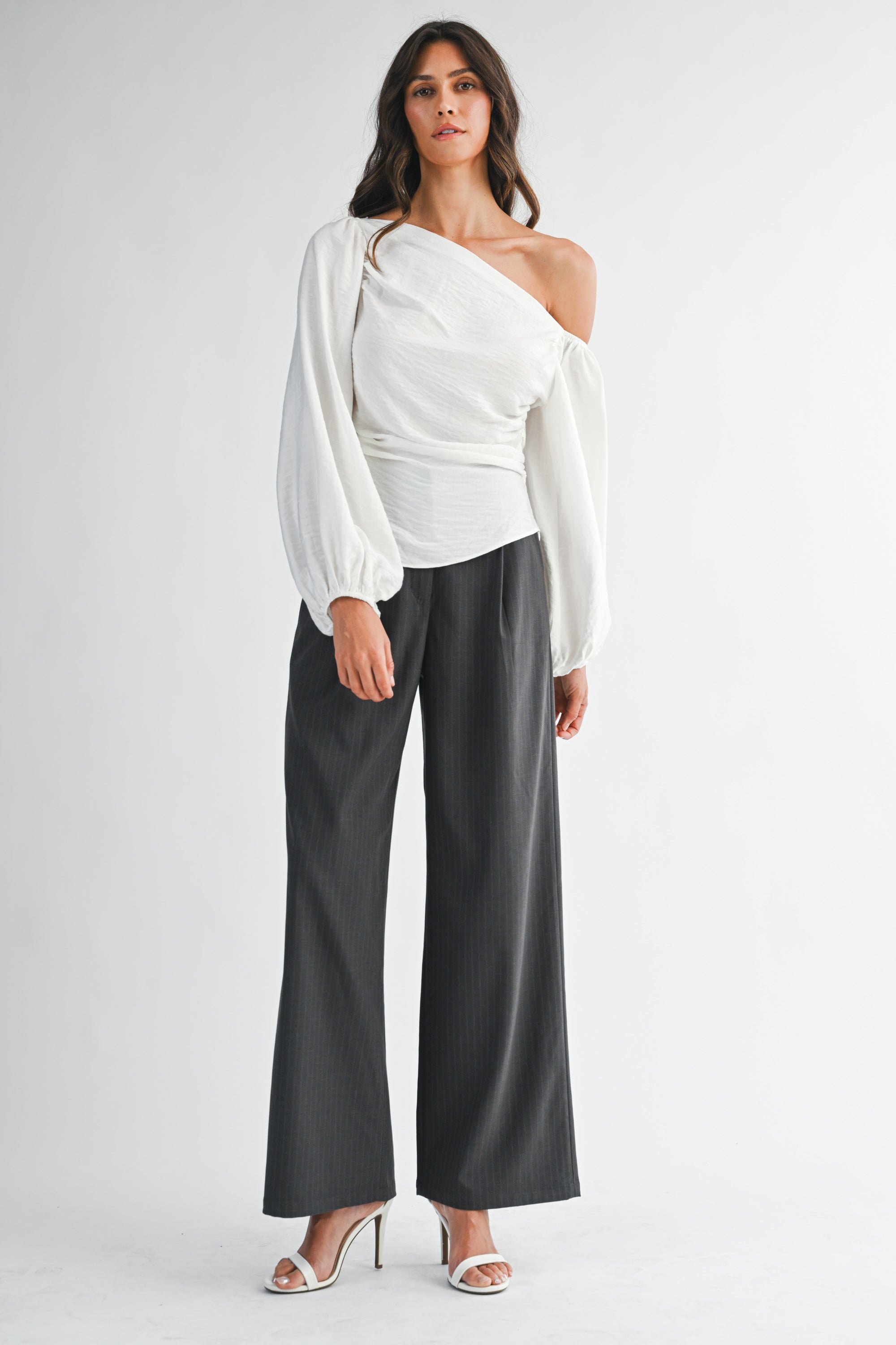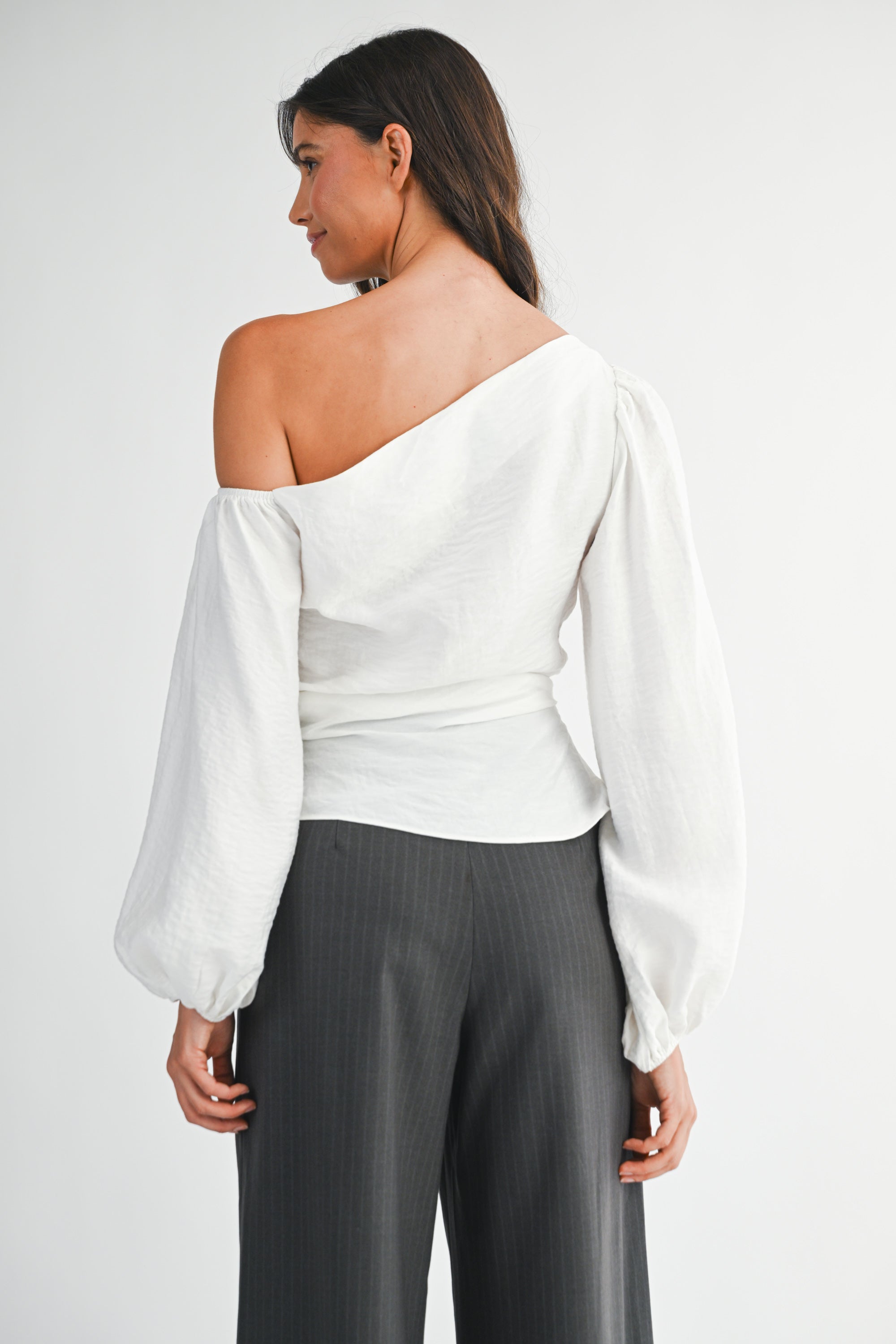 Make a statement with the Rushed Asymmetrical Long-Sleeve Top, designed with a striking one-shoulder neckline and gathered detailing that flatters your shape. The billowy sleeve and soft fabric add an elegant touch, perfect for both day-to-night wear.