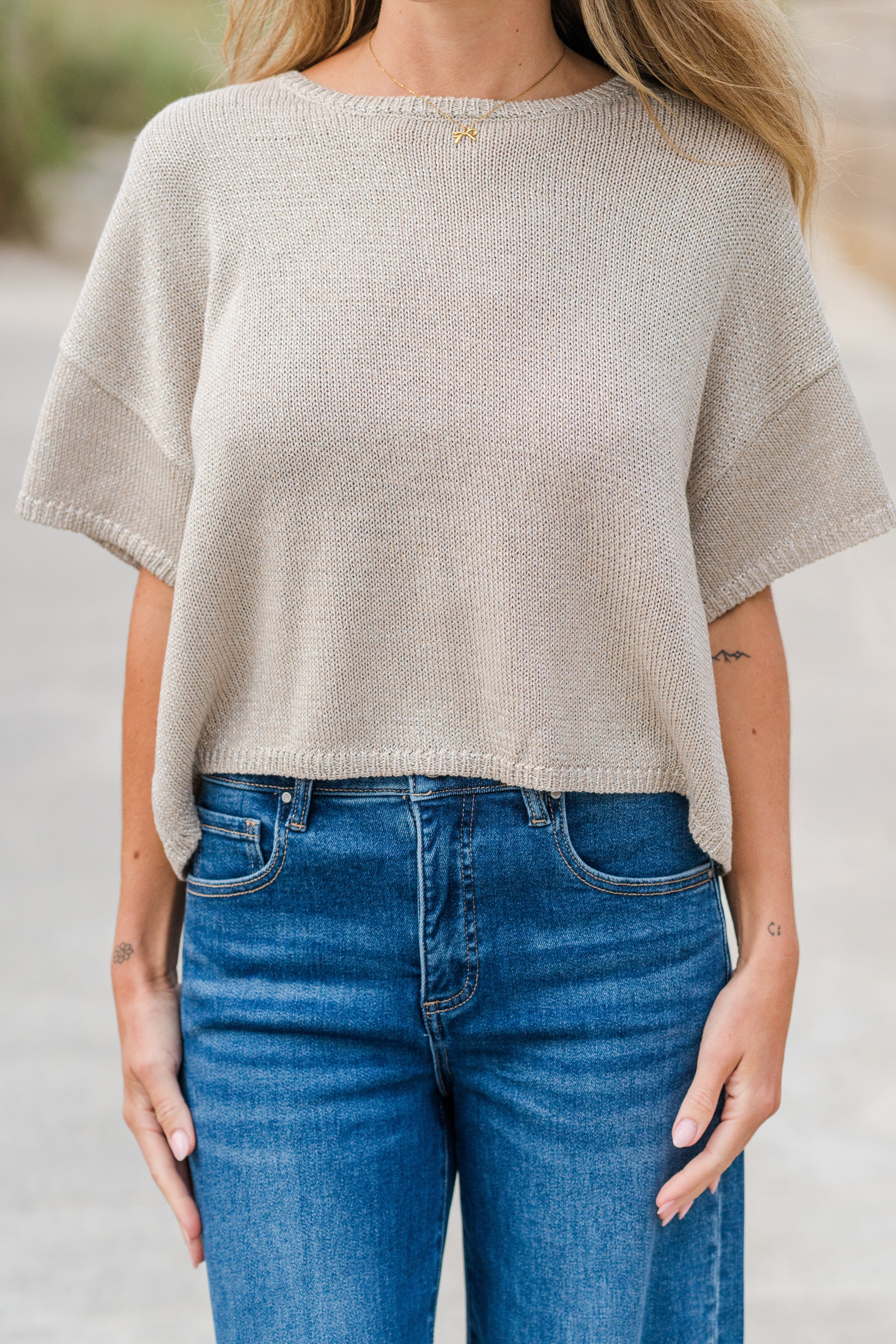 Effortlessly chic, this metallic knit top adds a subtle shimmer to your everyday style. Designed with a relaxed fit, short sleeves, and a soft drape, it’s the perfect blend of casual comfort and understated elegance.