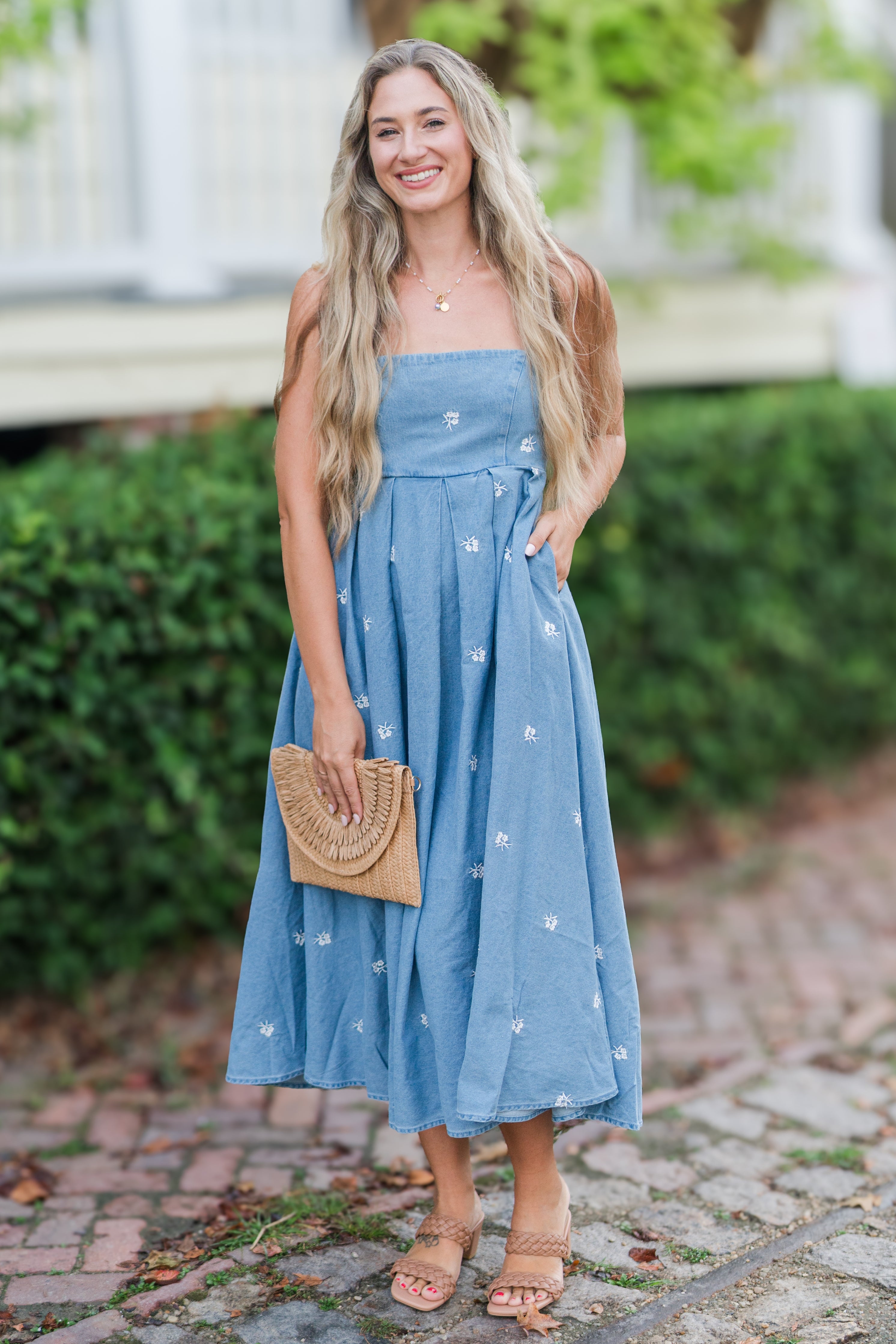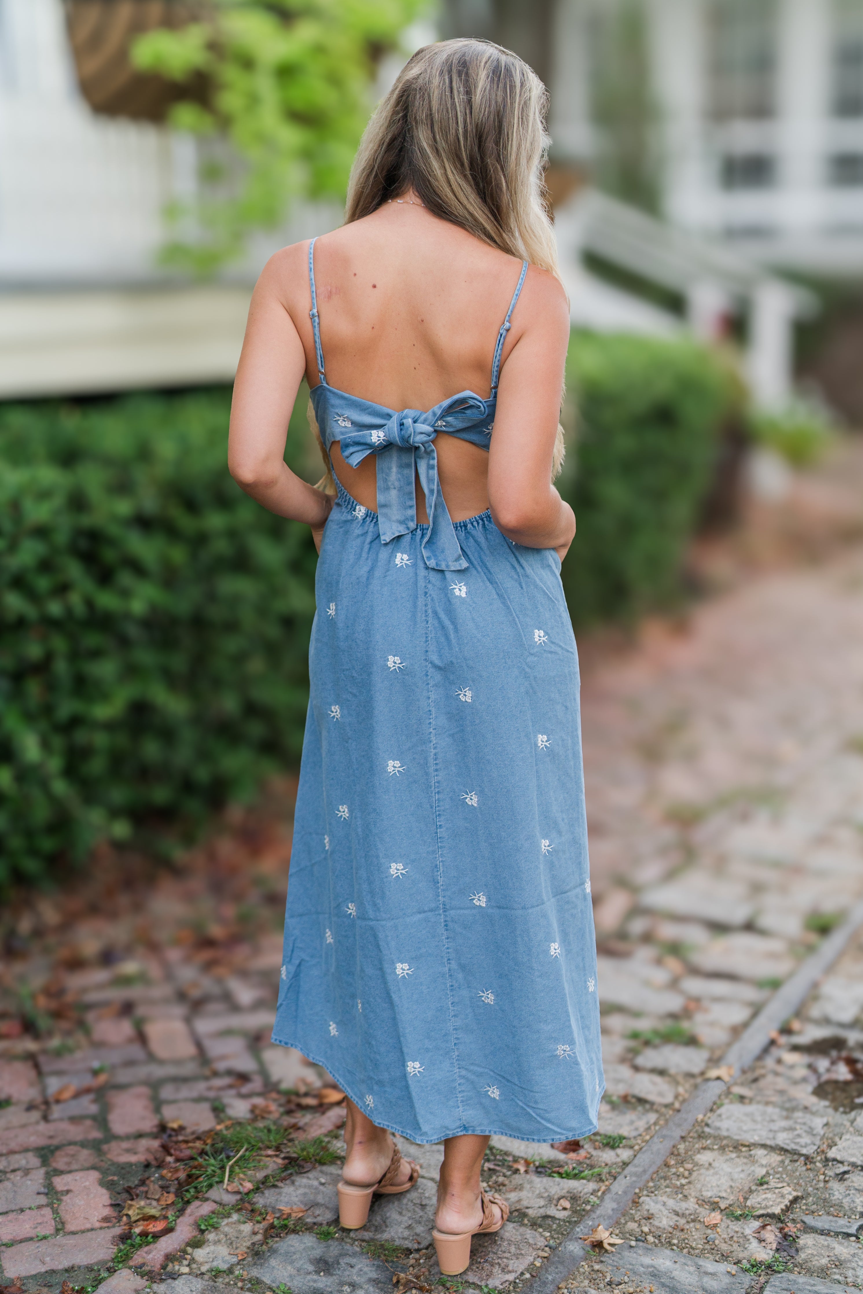 This tied back denim embroidery maxi dress features delicate white floral stitching for a charming, vintage-inspired touch. The adjustable tie-back detail and side cutouts add a flattering silhouette while keeping it breezy for warm days. With a full skirt and hidden pockets, it’s as functional as it is effortlessly feminine.