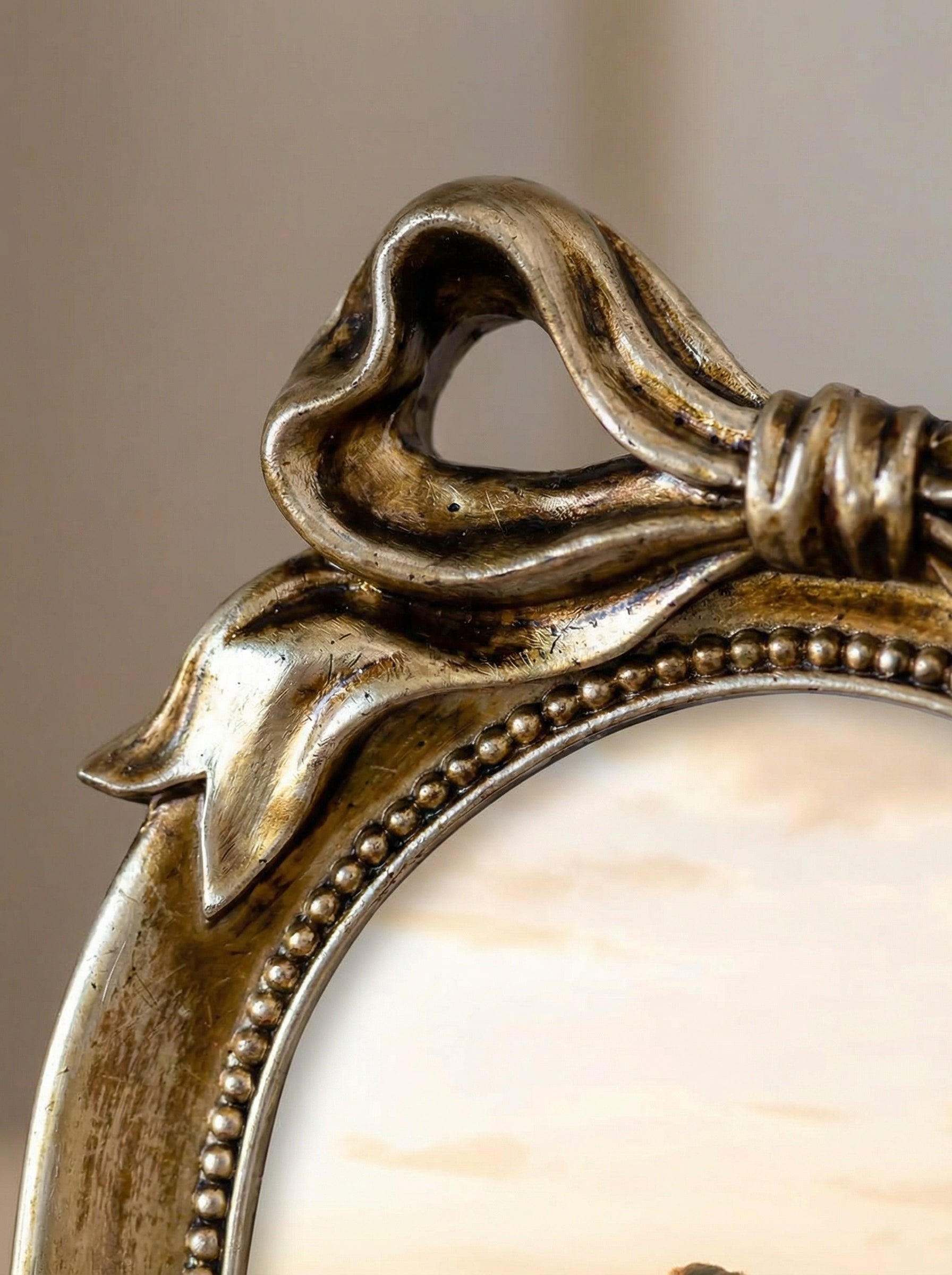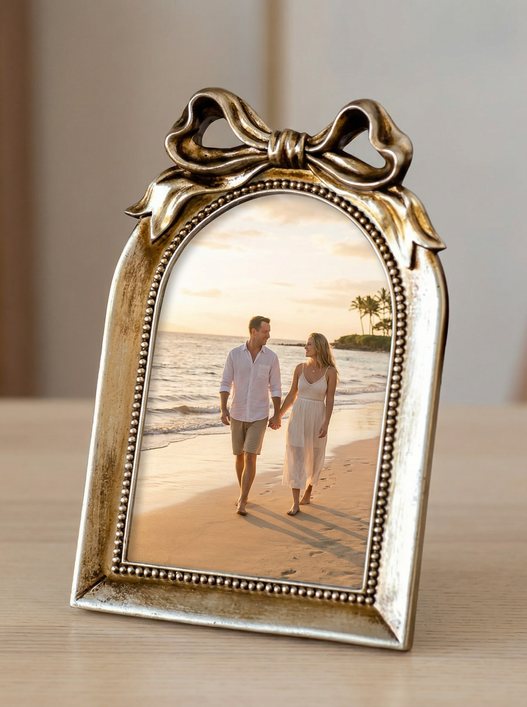 This arch bow picture frame features an elegant curved silhouette topped with a sculptural bow detail for a timeless look. The refined design adds a touch of sophistication to bookshelves, nightstands, or consoles.