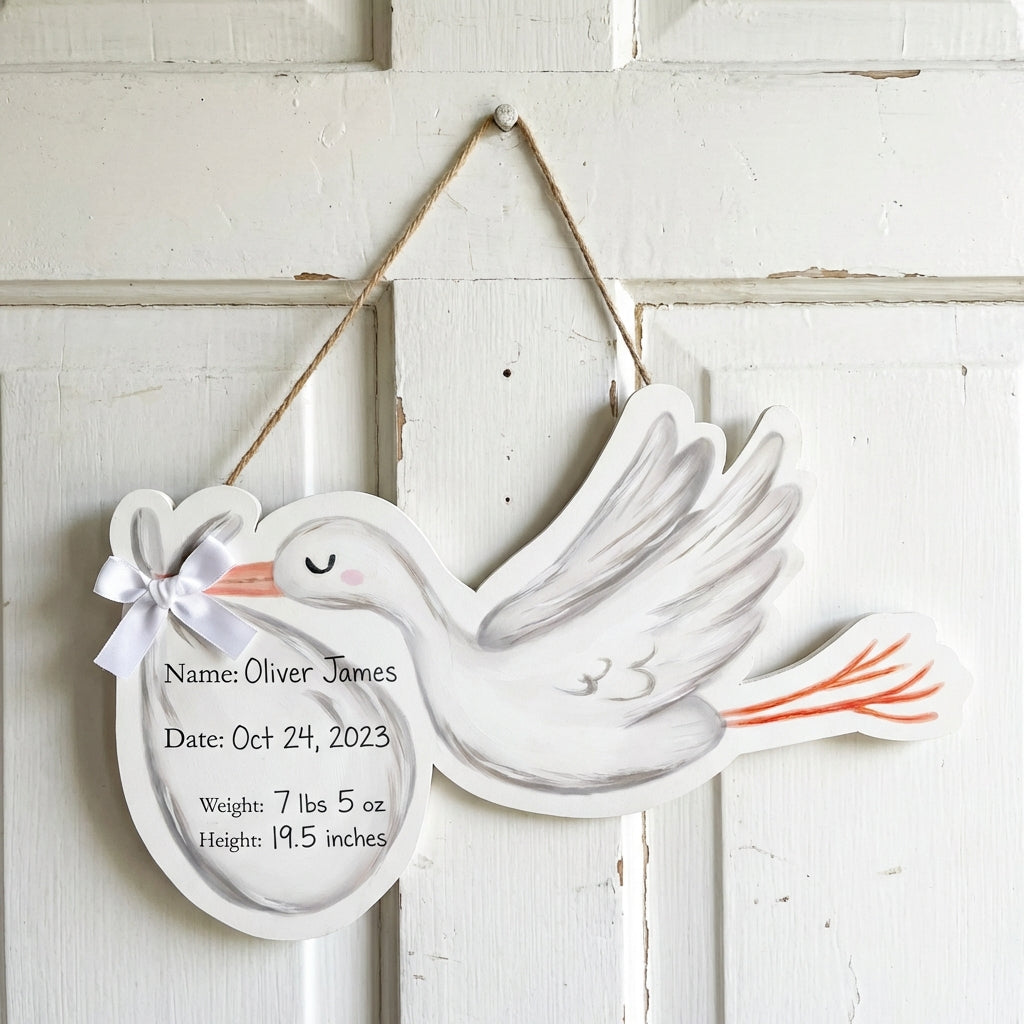 Celebrate the arrival of your little one with this charming Stork Personalized Door Hanger. Crafted from high-quality pine wood, this delightful stork-shaped decoration is perfect for announcing your baby's birth details in style.