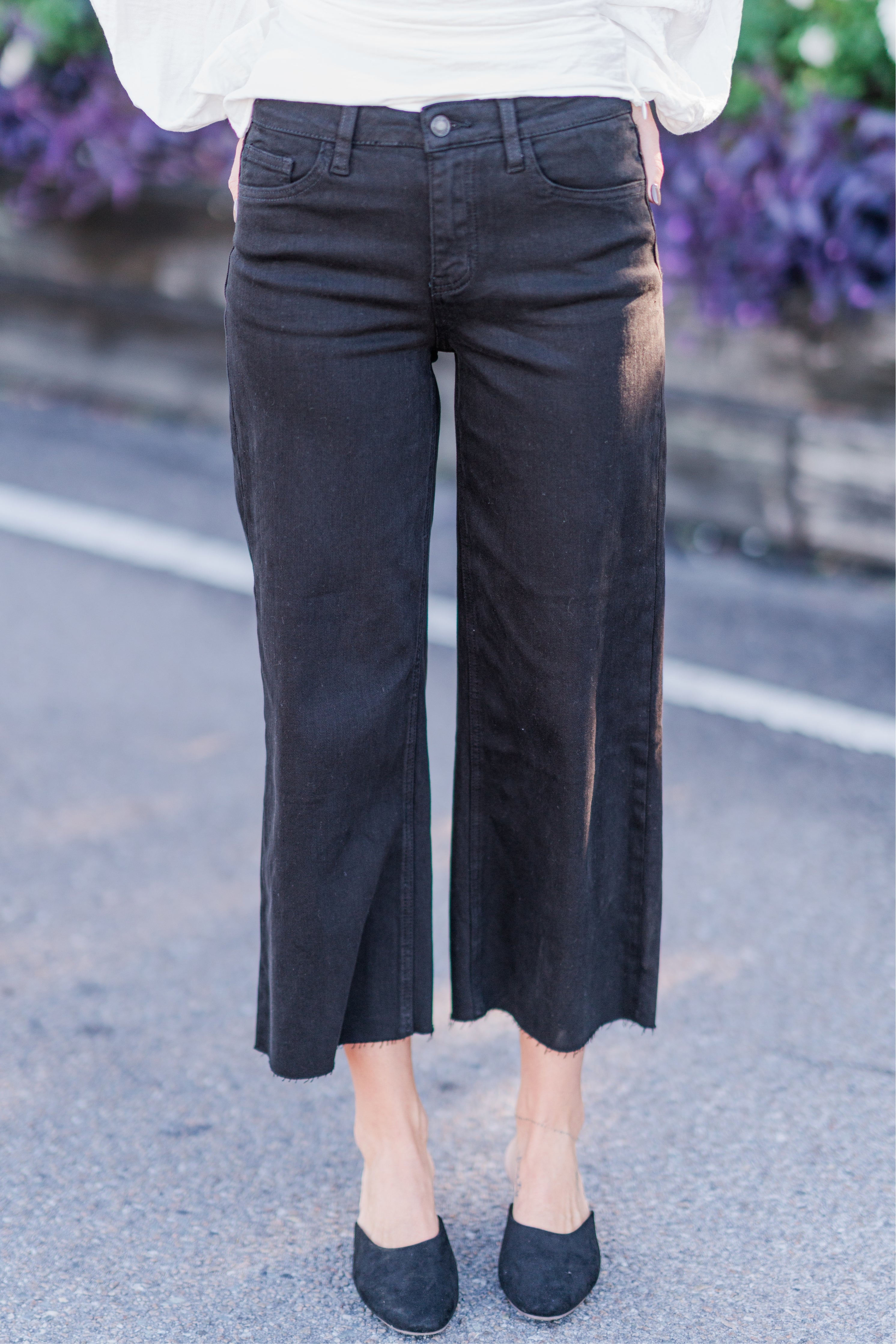Elevate your style with our High Rise Crop Wide Leg Jeans. Experience ultimate comfort with our stretch denim while the high rise waist and cropped length give you a flattering silhouette. The clean cut raw hem adds a touch of edginess to these wide leg jeans. Upgrade your wardrobe now!