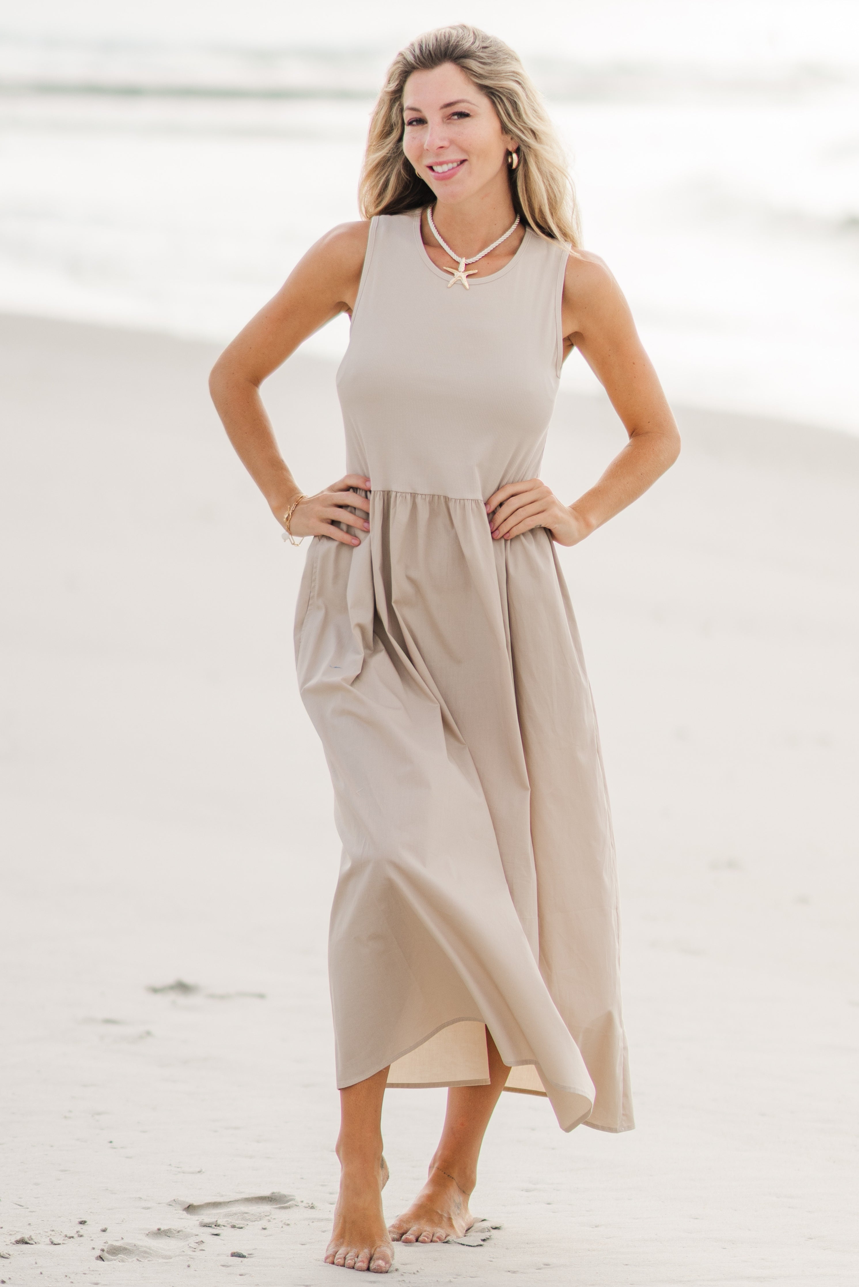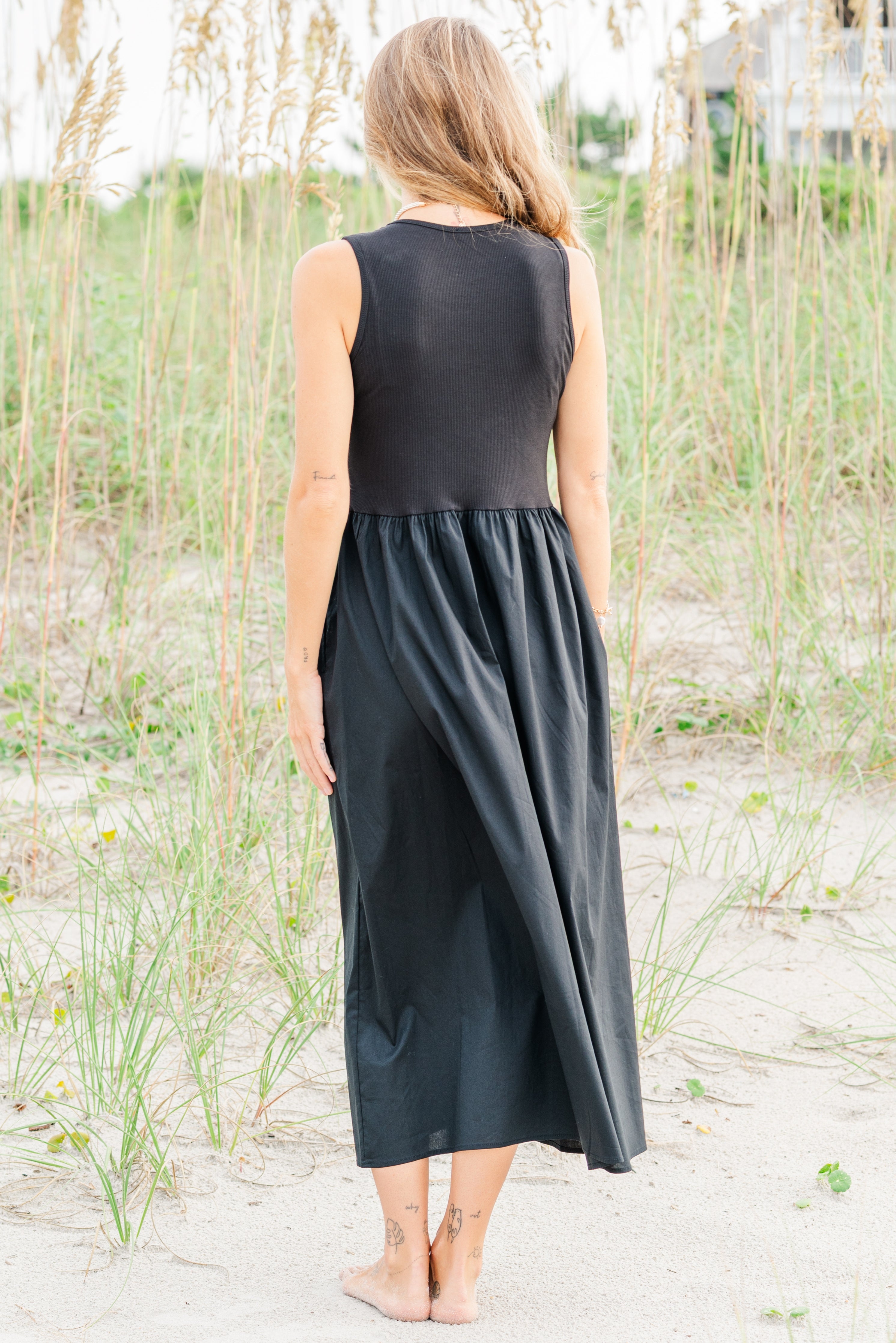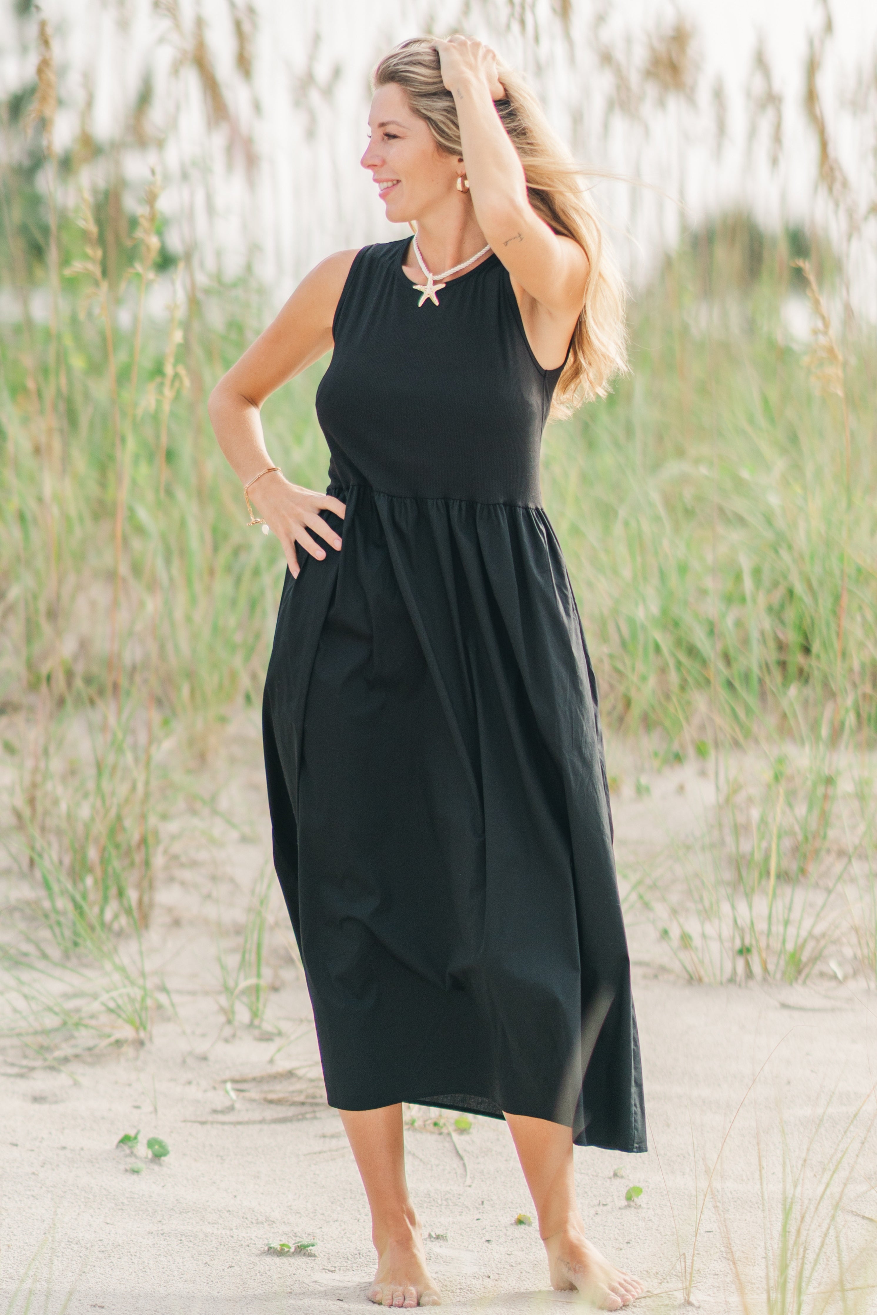 This solid contrast maxi dress features a soft, fitted knit bodice paired with a gathered woven skirt for a flattering, two-texture look. The sleeveless design and hidden side pockets make it as functional as it is stylish. Whether you choose the neutral beige or bold black, it's an easy go-to for warm days or layered looks.