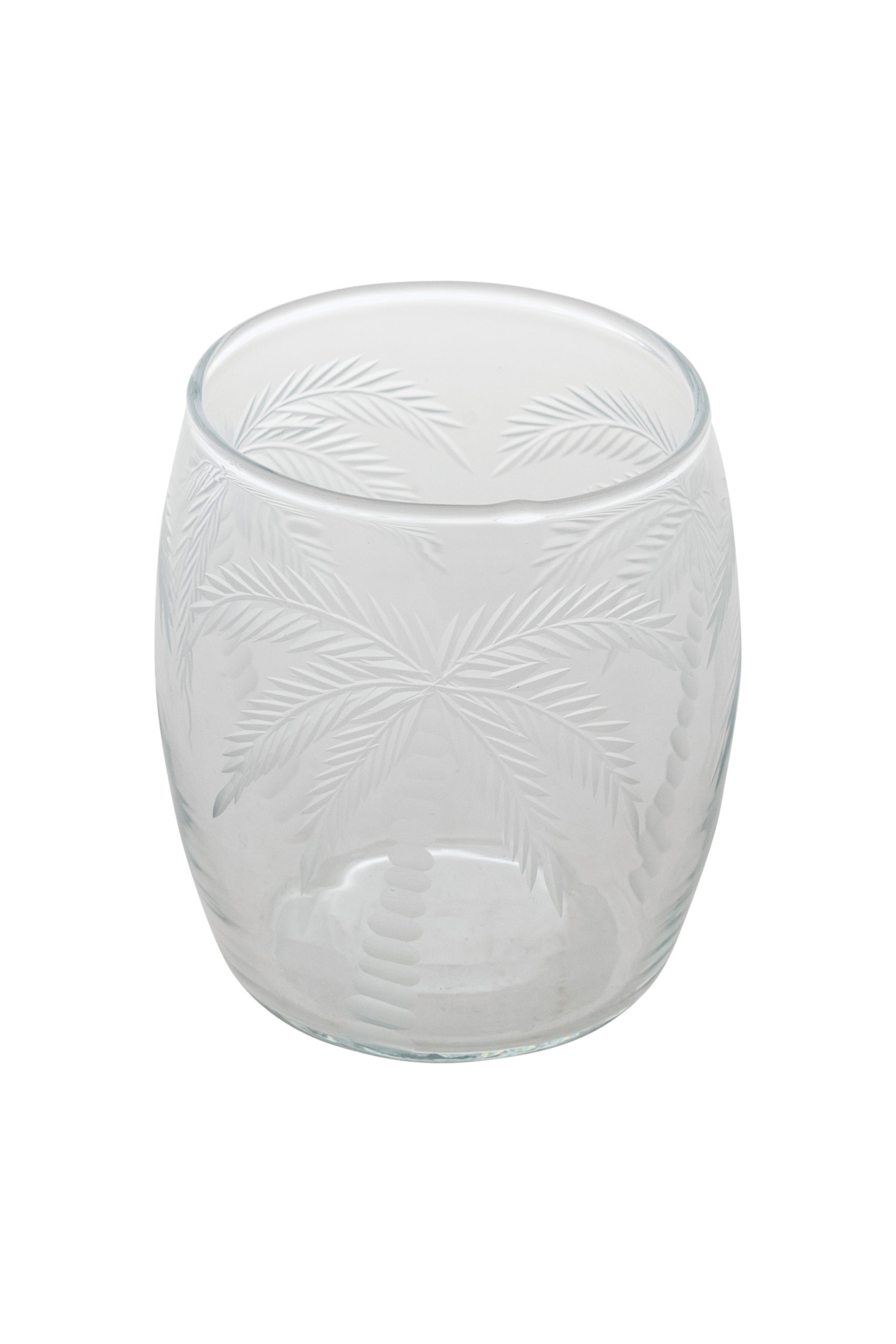 Bring tropical elegance to your table with this etched palm tree drinking glass. Each piece features delicate palm tree detailing that catches the light beautifully, adding a sophisticated coastal touch to everyday moments.