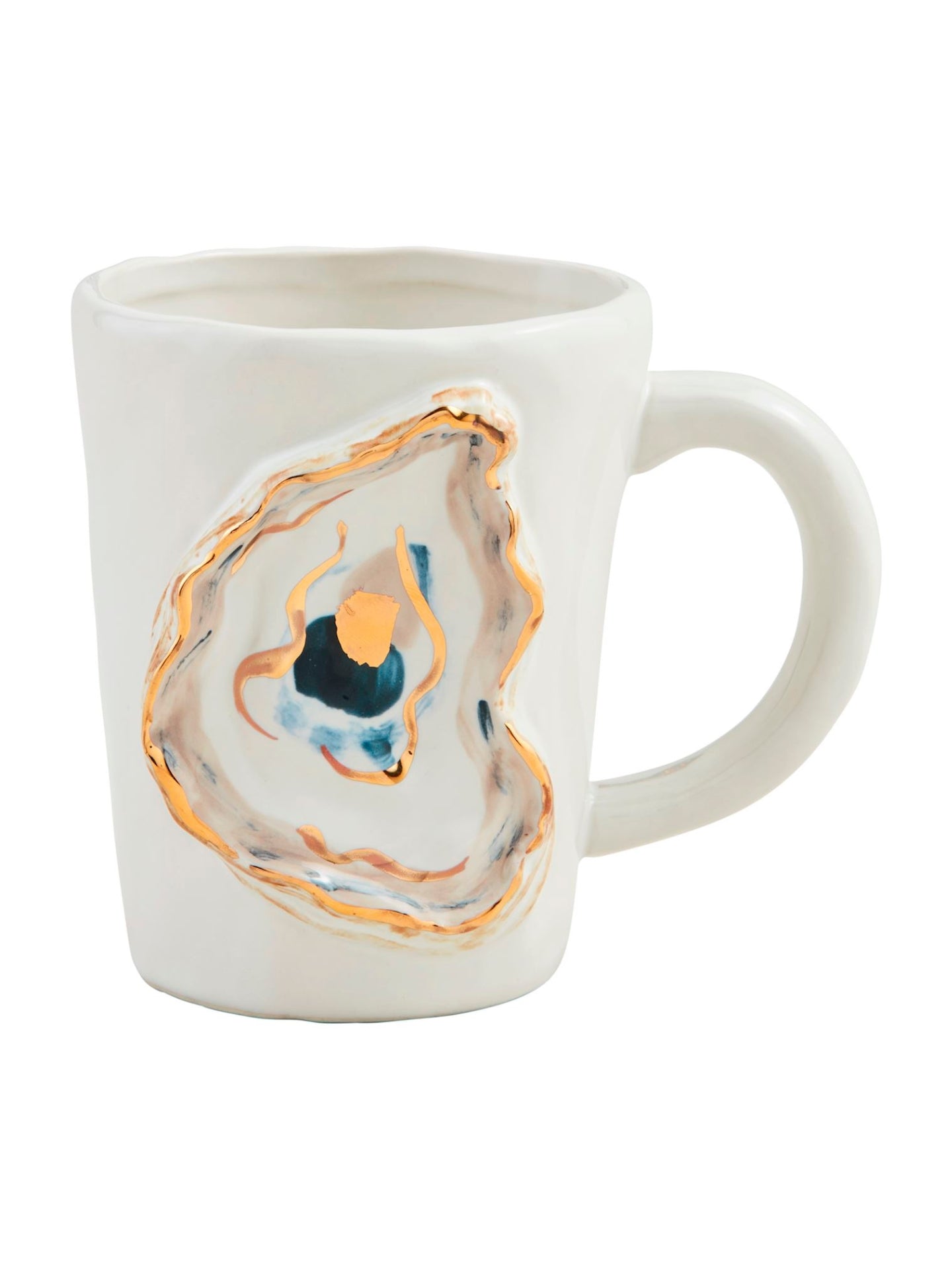Indulge in the ocean's beauty with our Oyster Shell Mug. Made of durable stoneware and hand-painted with intricate layered oyster shell designs, this mug is perfect for your morning cup of coffee or tea.