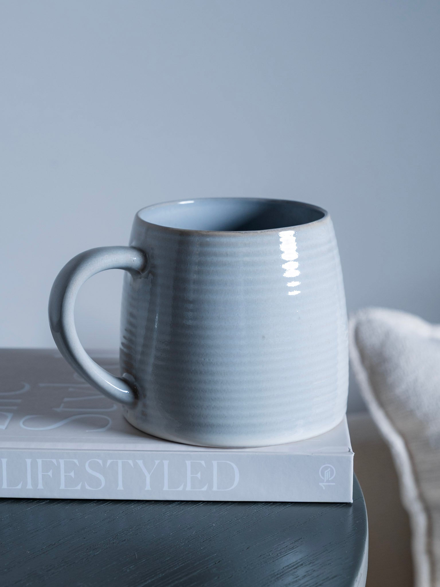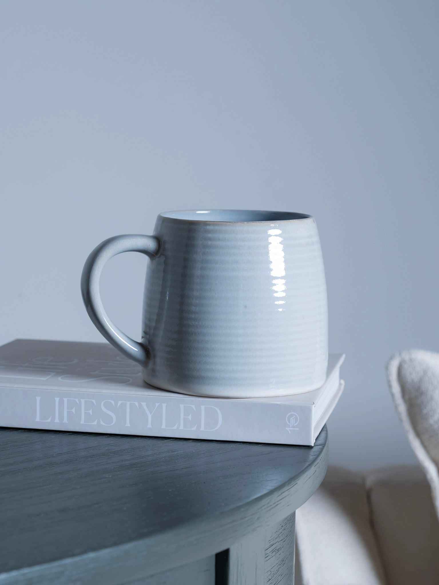 This ceramic mug features a subtly textured, ribbed design that adds visual interest while remaining timeless and easy to style. Its comfortable handle and sturdy feel make it ideal for everyday coffee or tea moments.