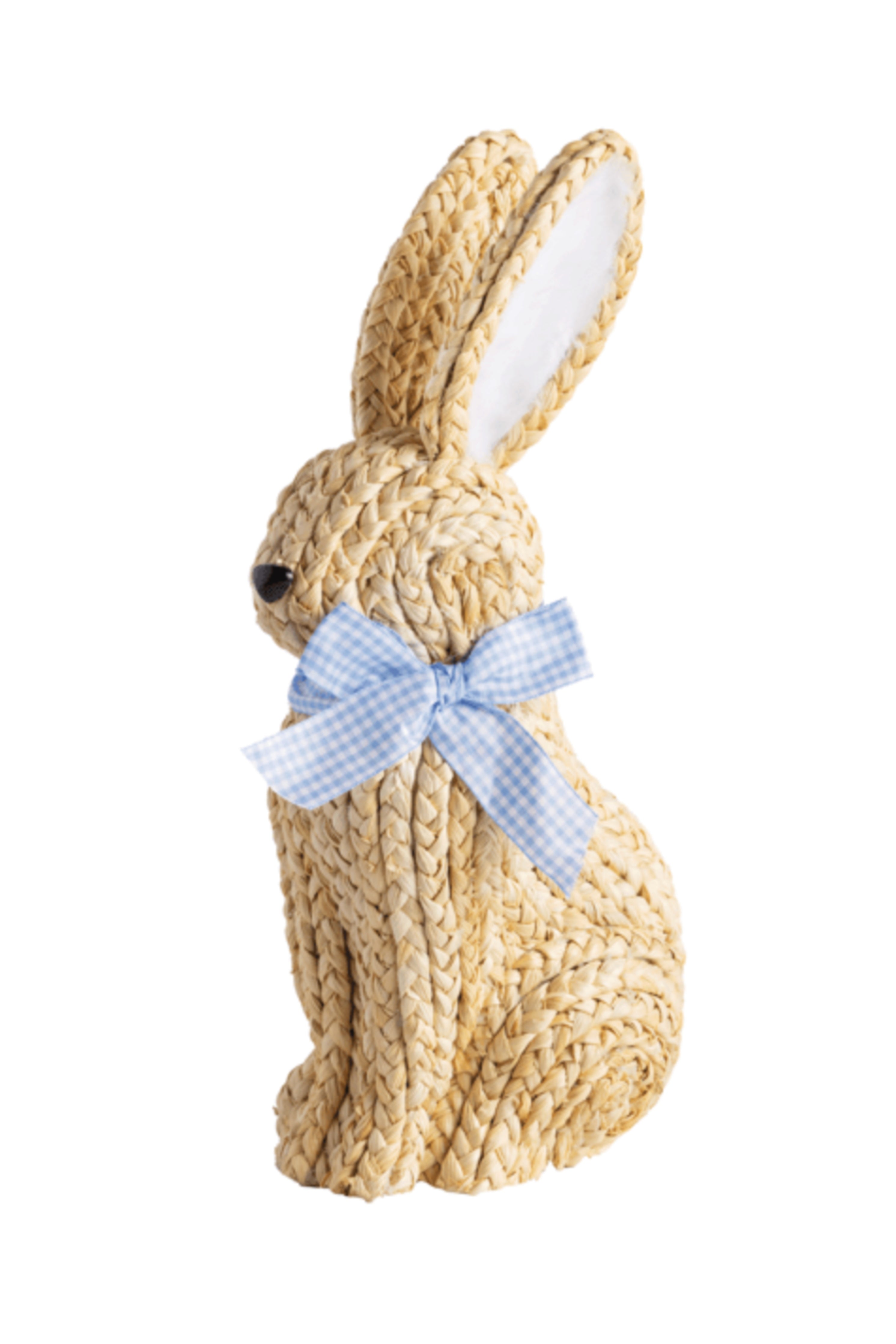 Add charming seasonal style to your décor with this Bow Woven Bunny Sitter. Handcrafted from natural raffia, this woven corn husk bunny features an elegant grosgrain ribbon bow for a sweet, festive touch. Its tall, sculptural silhouette makes it a perfect accent for Easter displays, spring tabletops, or shelves, blending natural texture with playful charm.