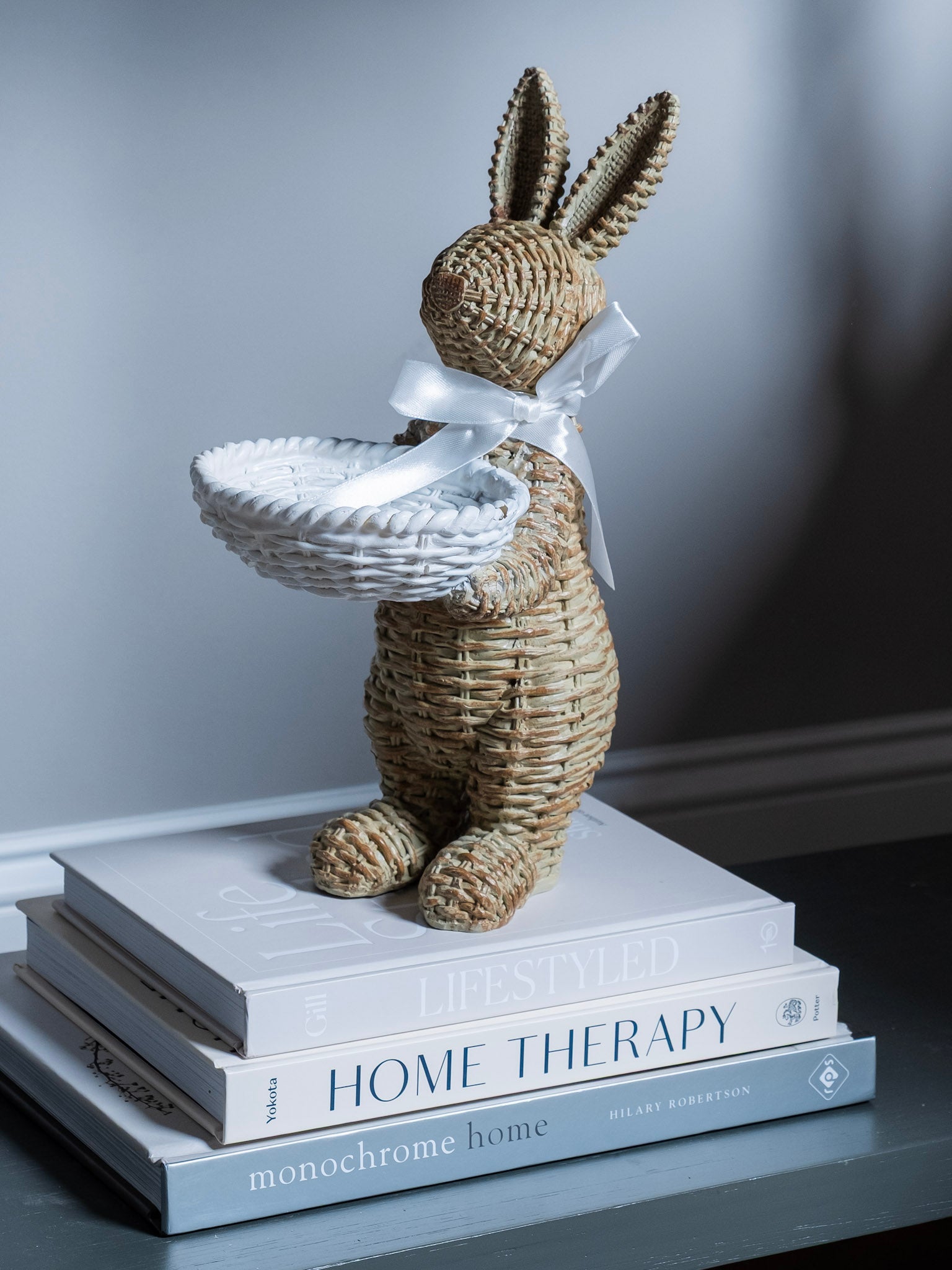 This handwoven bunny figurine features a charming natural wicker design accented with a soft white ribbon for a sweet, seasonal look. The bunny holds a small woven bowl, perfect for displaying Easter treats, decorative eggs, or small florals.