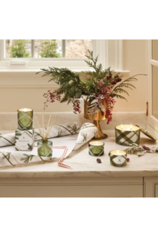 This Frasier Fir Frosted Plaid Poured Candle fills your space with the refreshing aroma of fresh-cut fir, cedarwood, and sandalwood. Its elegant green frosted glass and festive plaid design make it a beautiful seasonal accent. Perfect for cozy winter nights or as a thoughtful holiday gift.