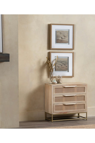 The Crestview Collection Bengal Manor Natural Cane Chest has three drawers that provide ample hidden storage space. Each drawer features a cane front. A gold, metal base holds up the light-brown wooden construction of the chest. This coastal, transitional piece makes the perfect accent piece for your living room or hallway.