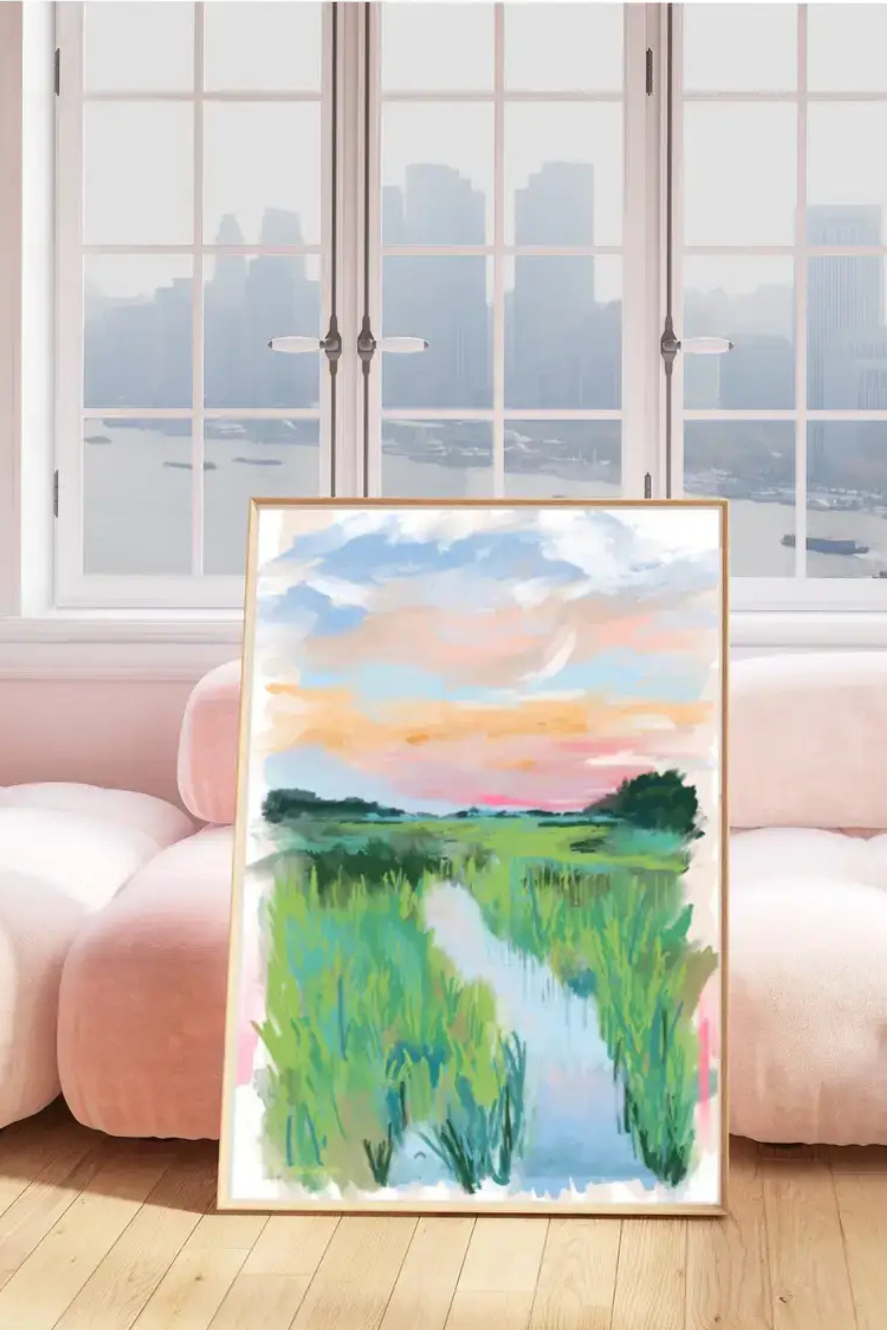 This serene landscape artwork captures a peaceful marsh scene with expressive brushstrokes and a soft, painterly feel. The winding waterway and open horizon create a calming sense of depth and natural beauty.