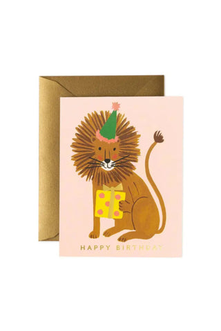 Make their birthday roar with this playful lion card, complete with a party hat and polka-dot gift. Set against a soft blush background with gold foil lettering, it’s both whimsical and charming. Perfect for kids and adults alike who love a little fun with their birthday wishes.