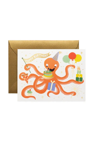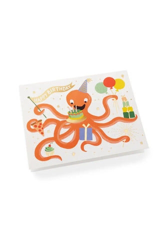 Celebrate with a splash using this delightful octopus birthday card, showcasing a multitasking sea creature juggling cake, presents, balloons, and pizza. The cheerful artwork and party hat bring humor and energy to the occasion.