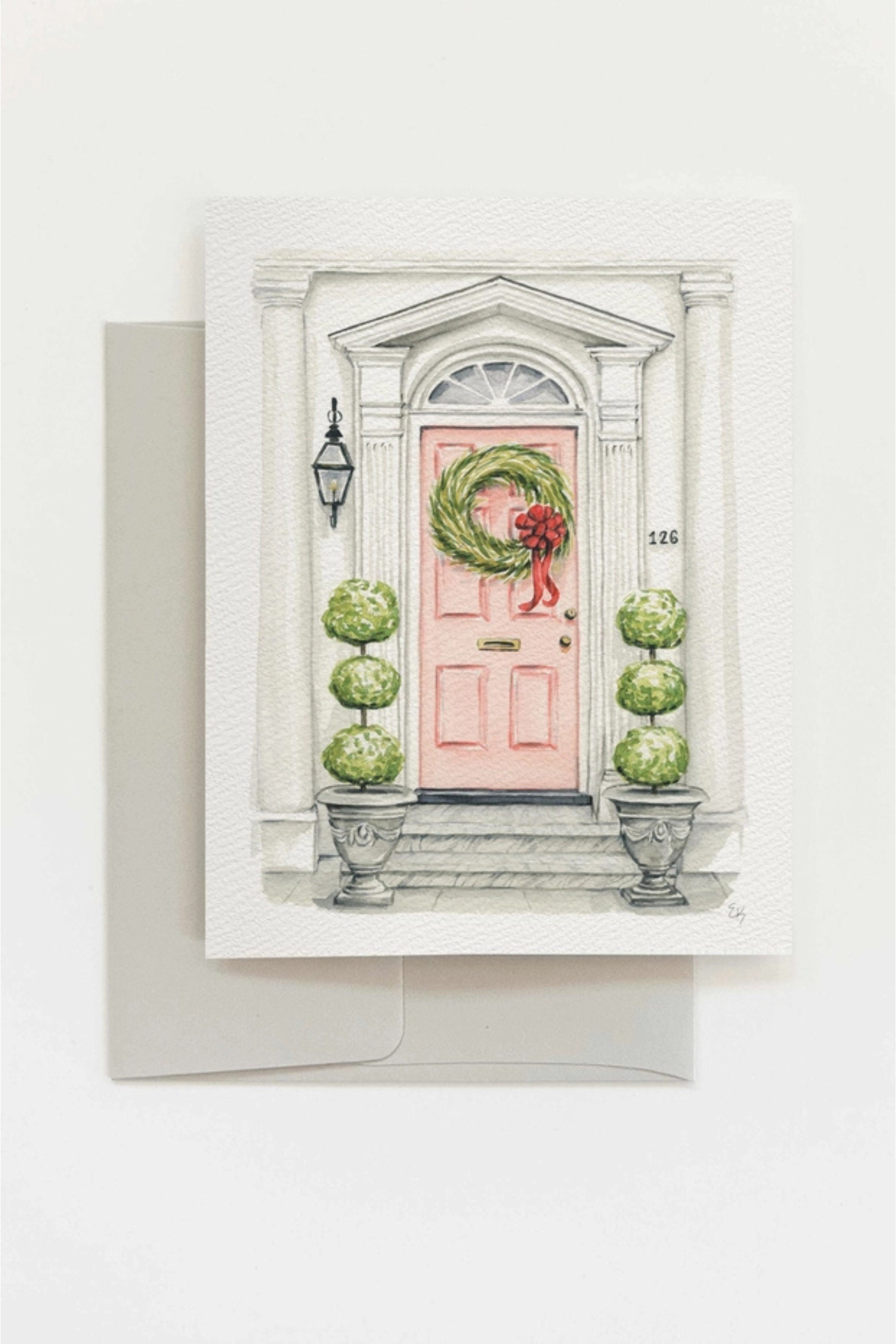 Inspired by the architectural design of the Low country, the artwork showcases an intricately detailed, timeless front door from Charleston, SC. A festive wreath adorns the iconic Holy City door.