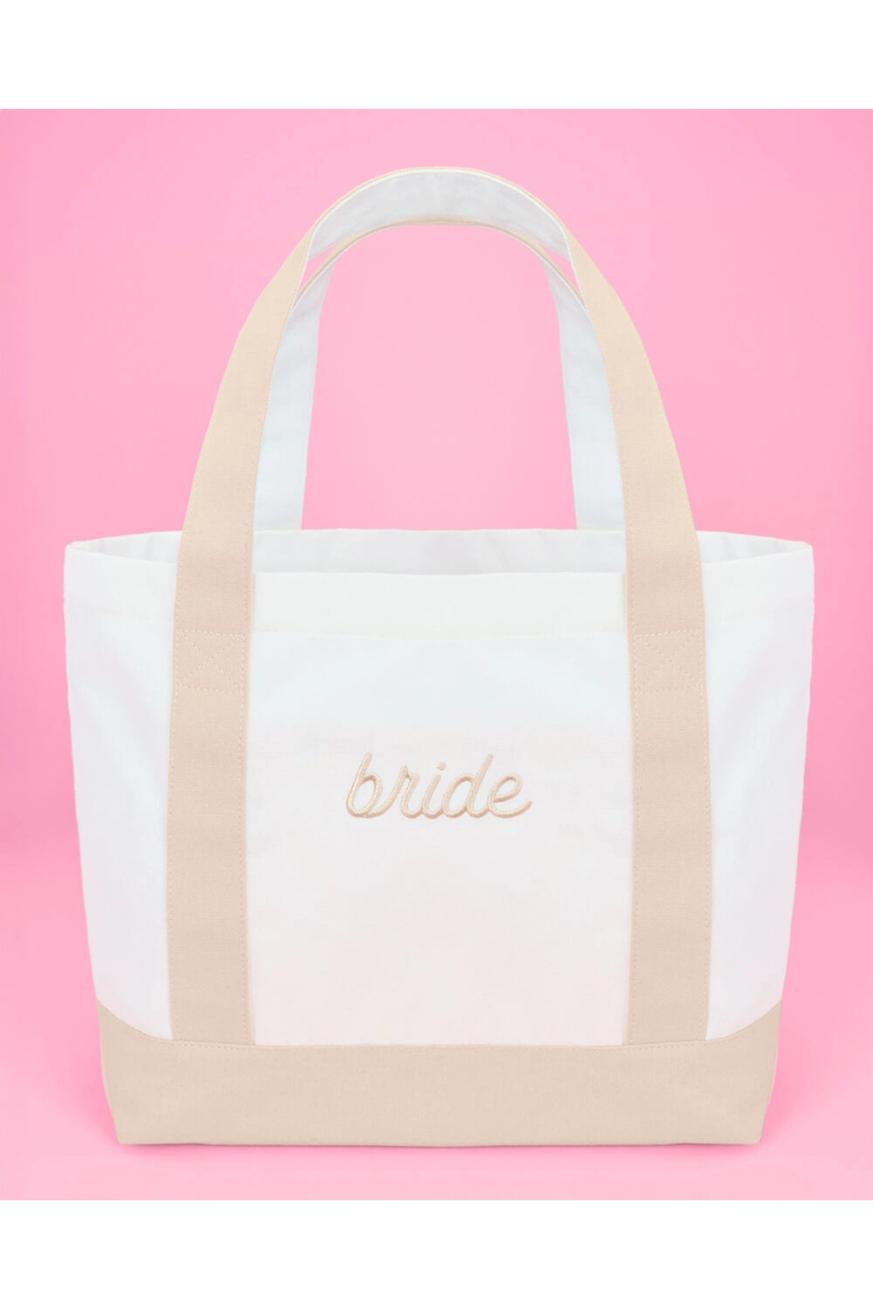 Bride Canvas Tote Bag with embroidered script and neutral color-block design. Perfect for wedding day essentials or honeymoon packing. Durable cotton construction with sturdy handles.