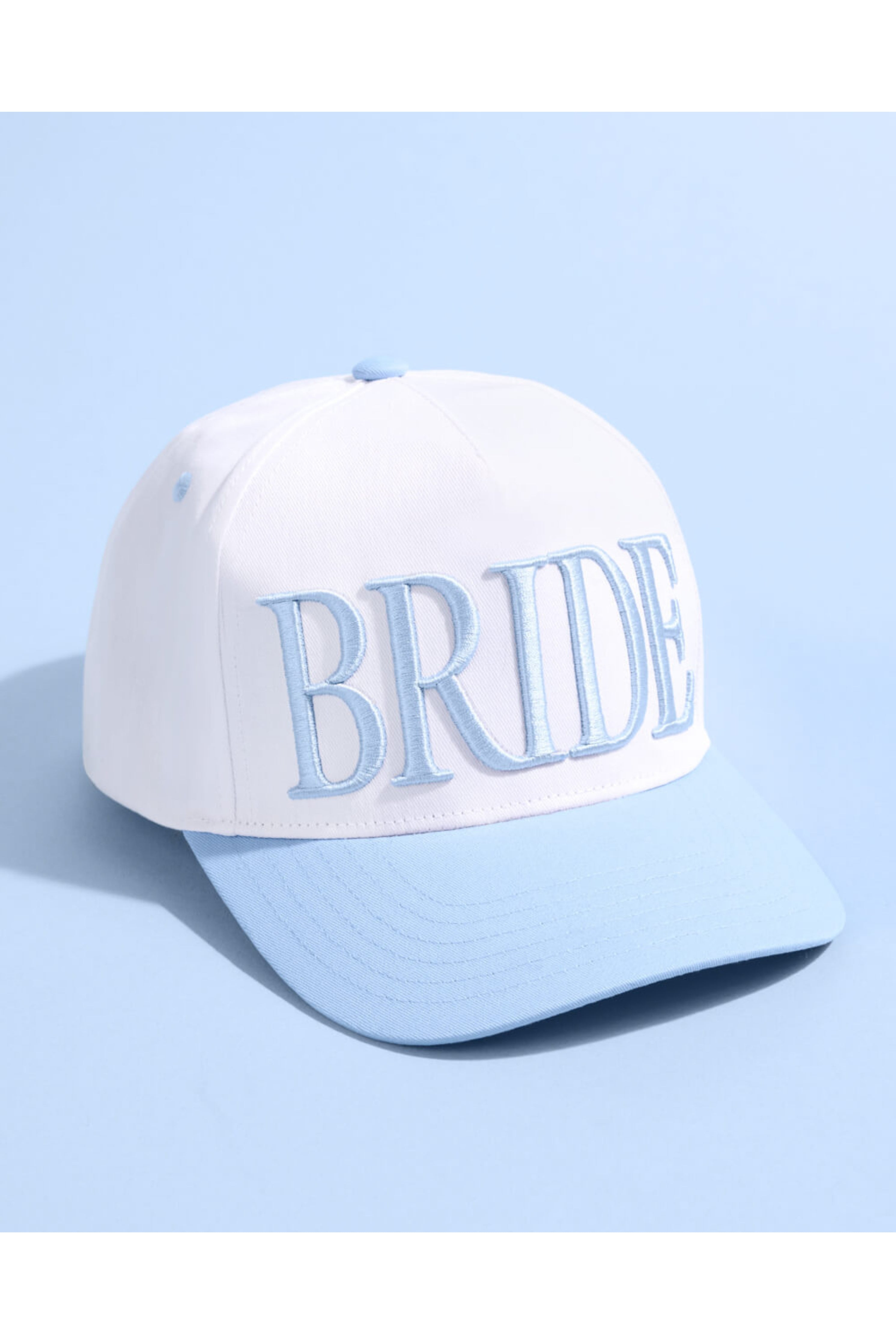 Bride Baseball Cap with light blue embroidery and matching brim. Adjustable snapback fit in soft cotton blend for a casual, bridal-ready look.